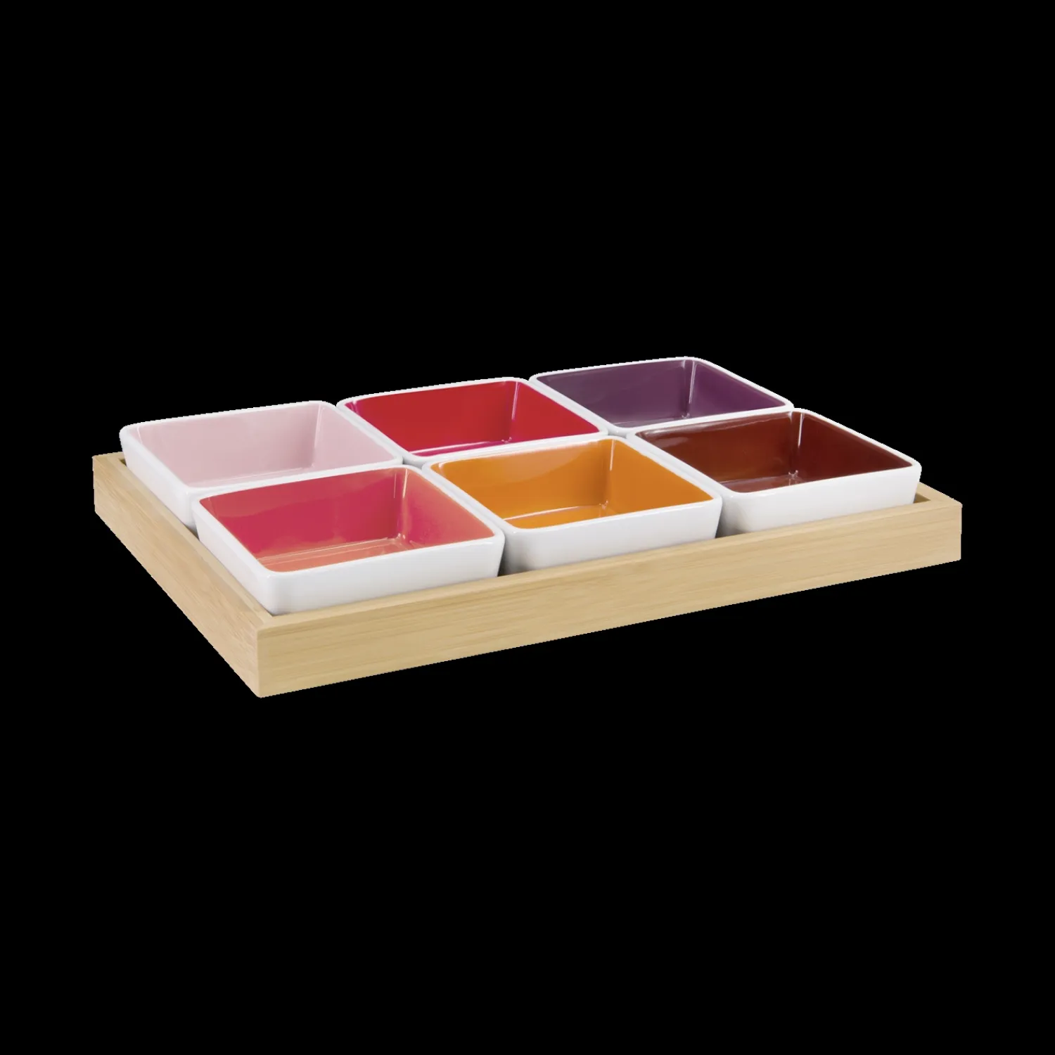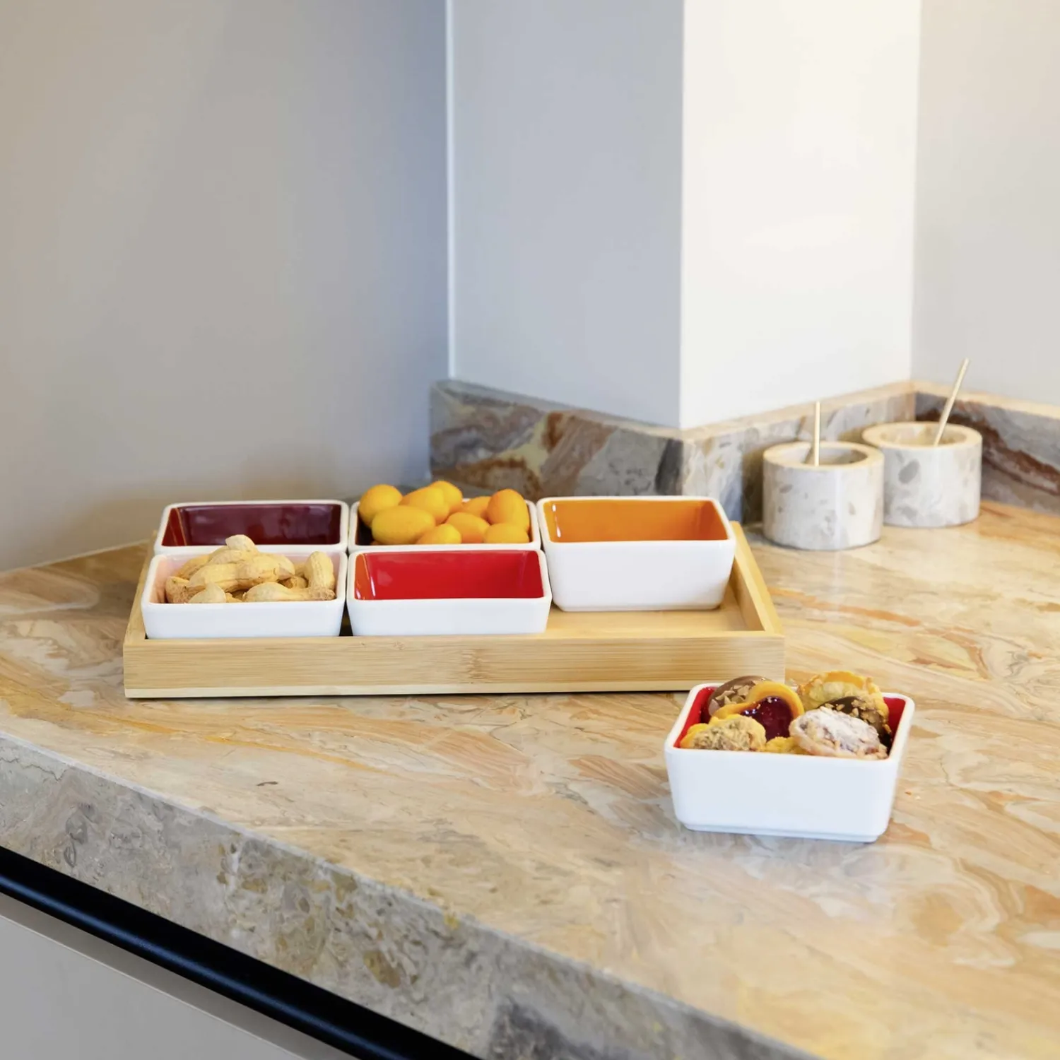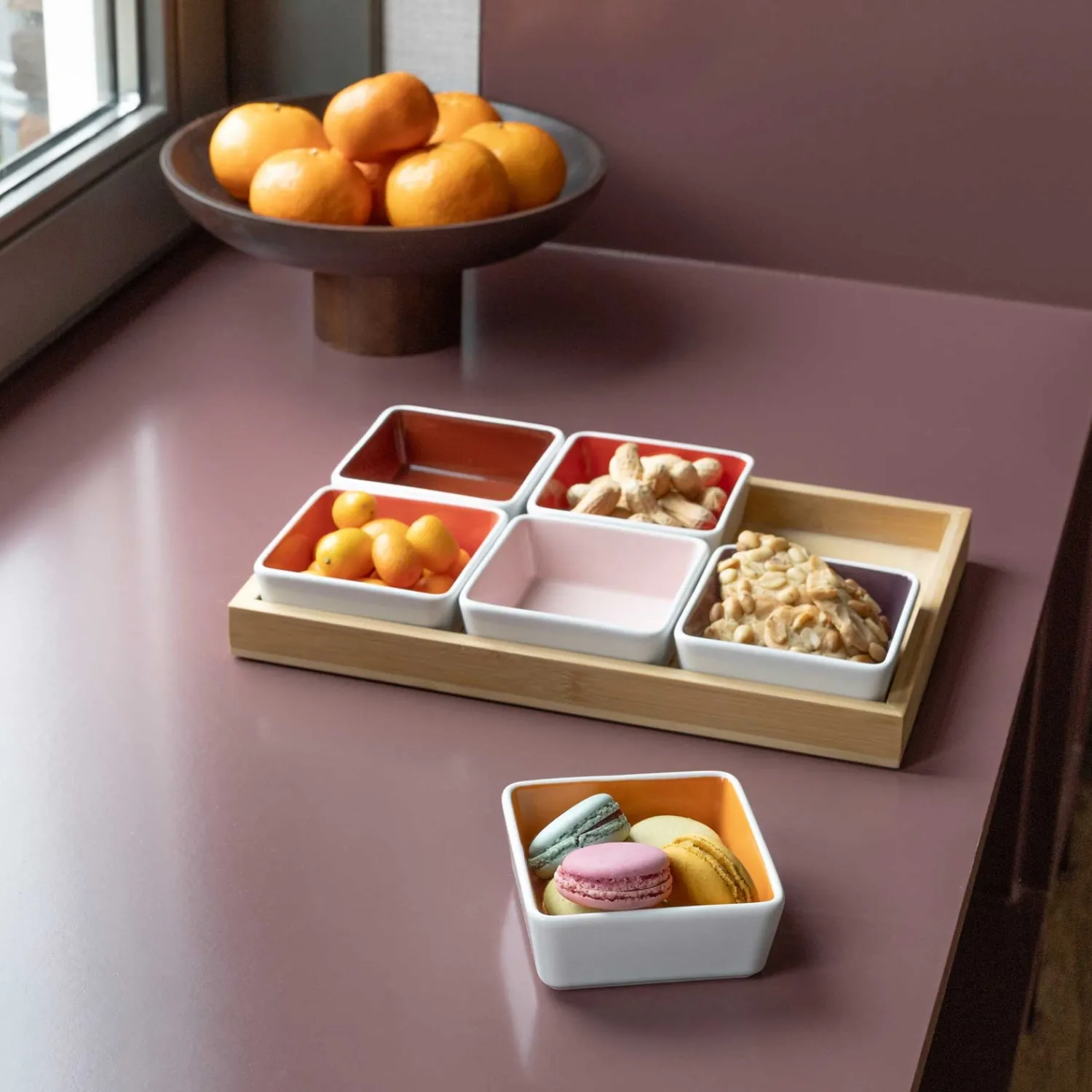 Skåle på bakke er en praktisk løsning til opbevaring af små genstande i dit hjem. Med seks skåle arrangeret på en bakke i træ kan du nemt holde styr på nøgler, smykker eller andre småting, så de ikke ligger og roder rundt.