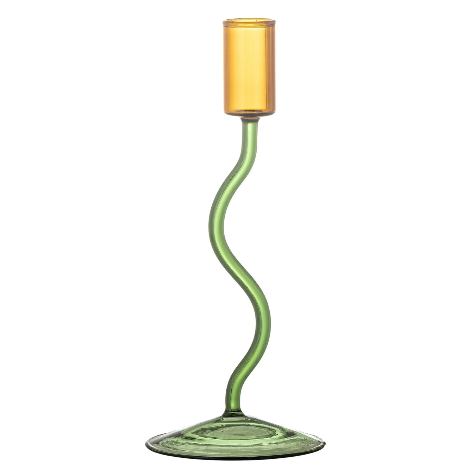 Denne mundblæste lysestage fra Bloomingville kombinerer en bølget stilk med en stabil, rund fod. Den grønne glaskonstruktion med kontrastfarvet top måler 22 cm i højden og 9 cm i diameter.