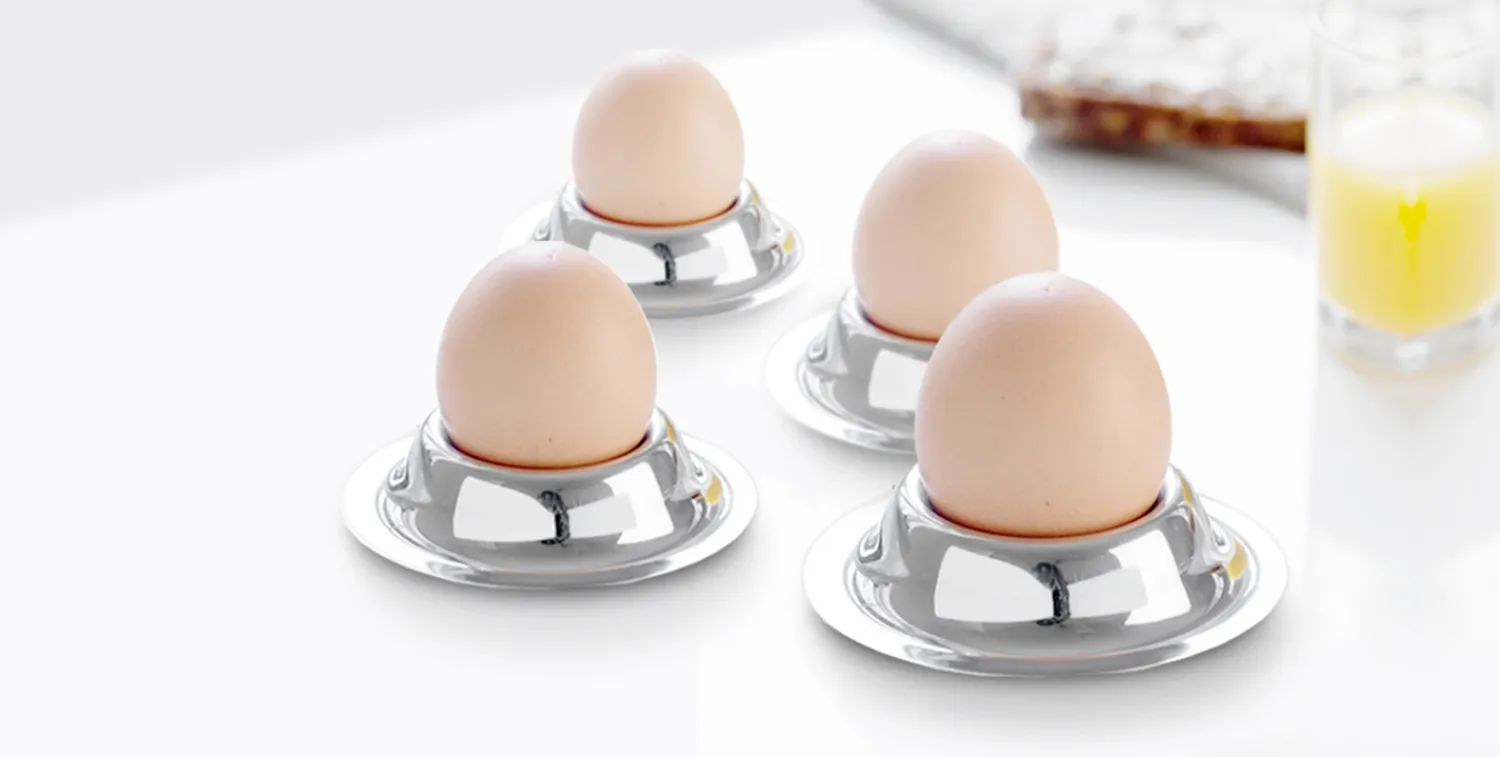 Dette sæt med fire æggebægre i rustfrit stål giver dig holdbare og vedligeholdelsesvenlige serveringsmuligheder til morgenbordet. Den blanke overflade er nem at holde ren og giver en flot præsentation af dine blødkogte æg.