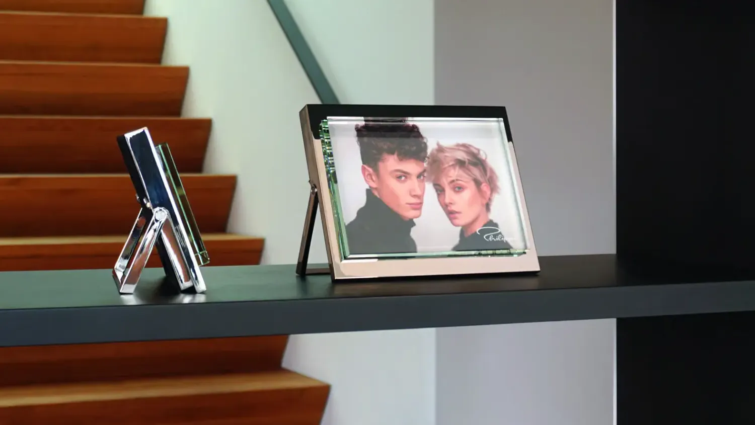 Alba-rammen er omhyggeligt fremstillet af støbt metal med en nikkelspejlpoleret overflade. Det 12 mm tykke glas beskytter dit fotografi og fremhæver billedets klarhed. Rammens skinnende, moderne udseende tilføjer et strejf af elegance til ethvert rum.
