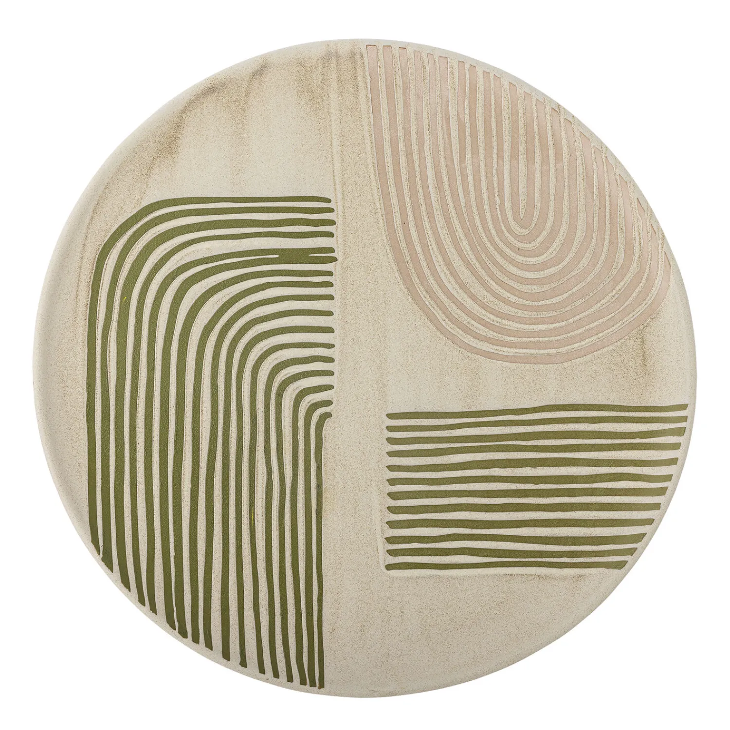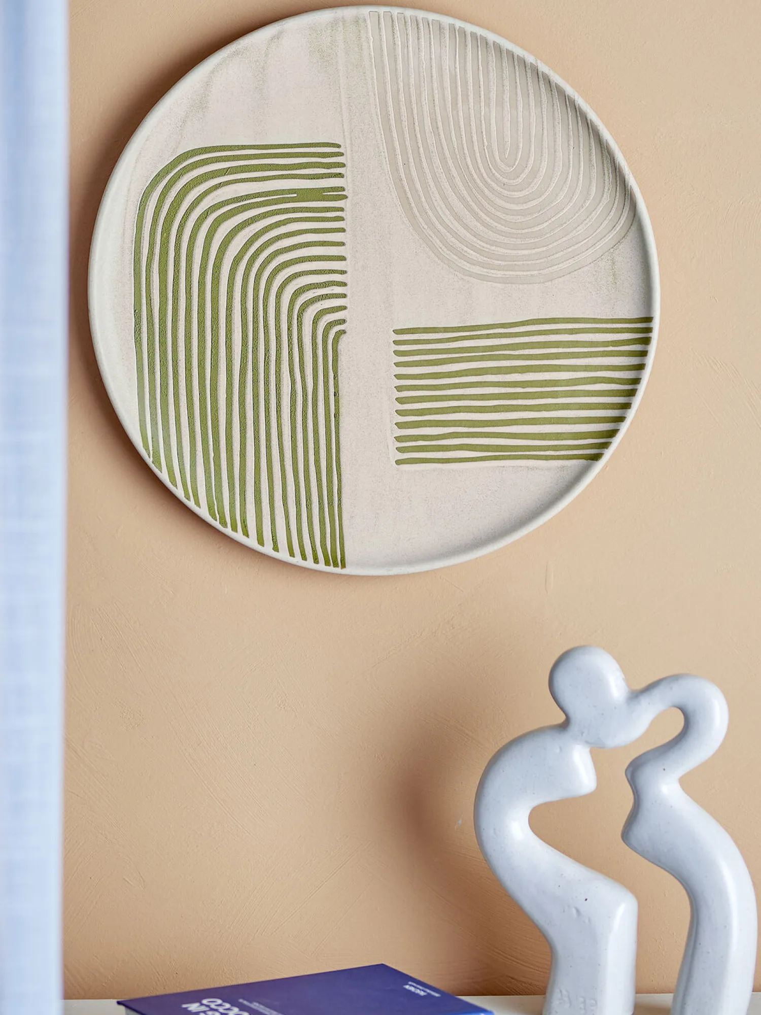 Dette håndmalede serveringsfad i stentøj kombinerer funktionalitet med kunstnerisk udtryk. Fadet er fødevaregodkendt og tåler opvaskemaskine, hvilket gør det praktisk til daglig brug. Den reaktive glasur skaber unikke variationer i det dekorative mønster.