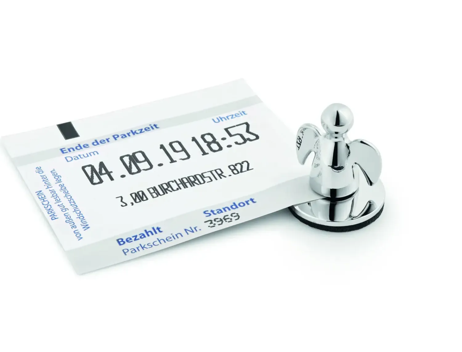 Angelo billetholderen er fremstillet af nikkel og rustfrit stål med en poleret overflade. Den har en kompakt størrelse på 2,8 x 2,5 x 2,8 cm, og den særlige engelform giver produktet et karakteristisk præg.