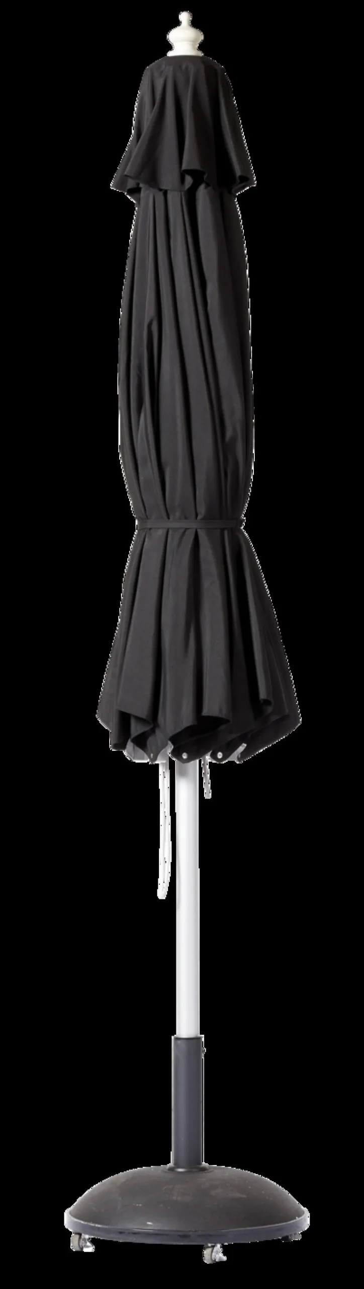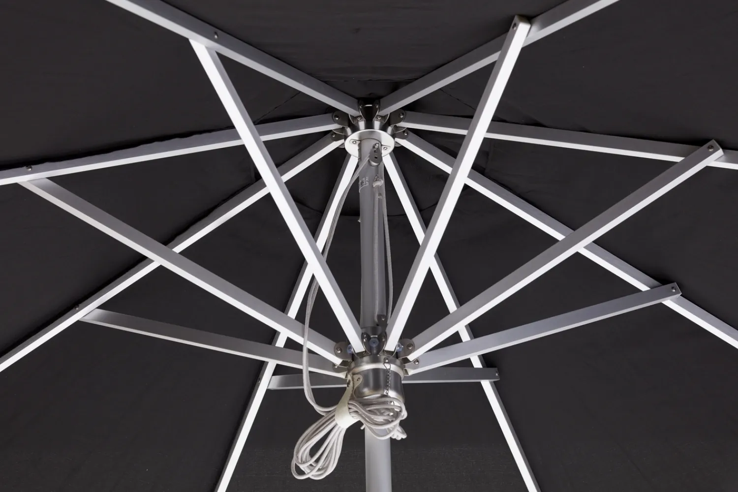 Cinas – Antibes parasol ALU Ø3,3m sort er en rummelig tilføjelse til haven eller terrassen. Denne vandtætte parasol giver dækning til udendørs møbler og er ideel til det skiftende danske vejr.