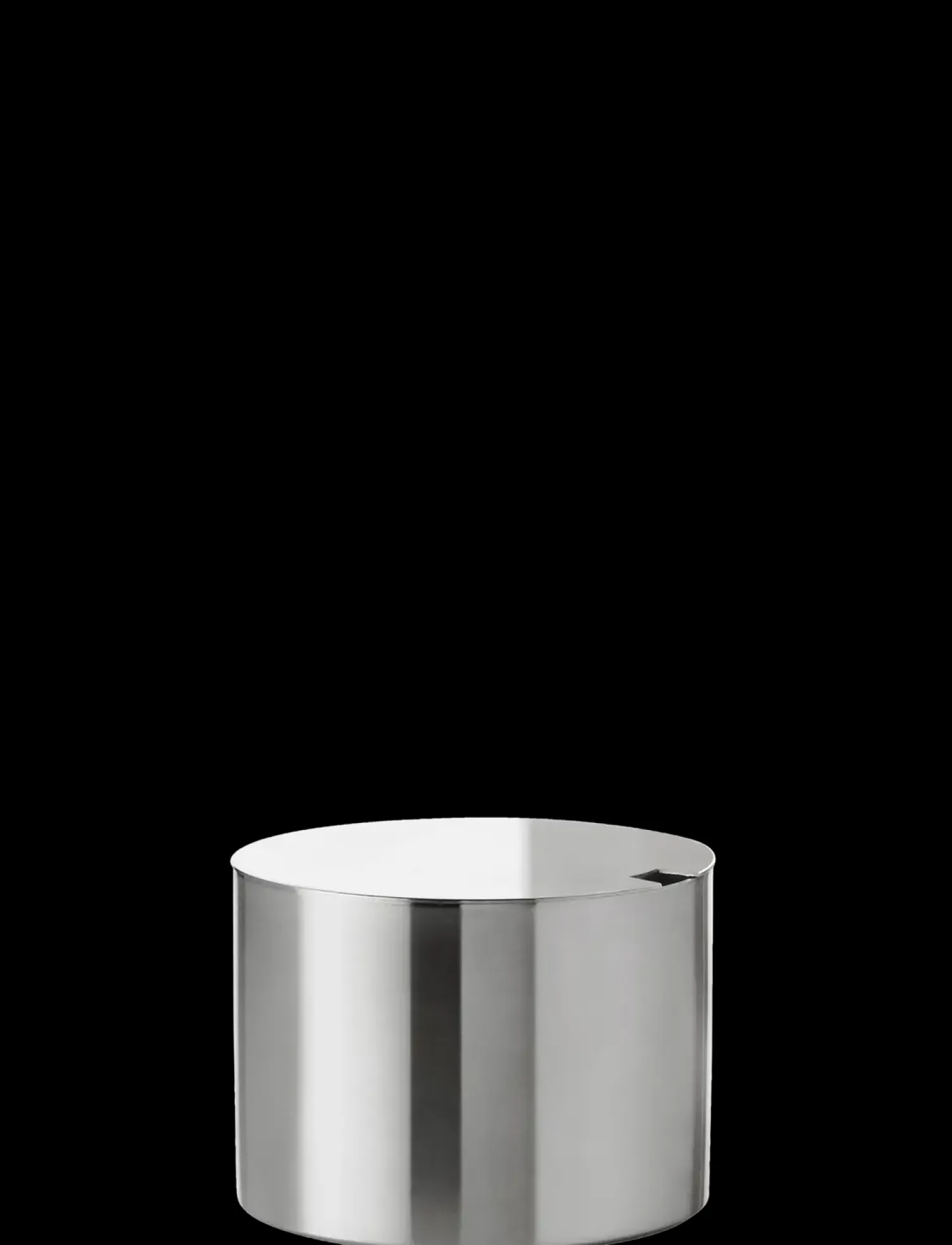 Arne Jacobsens sukkerskål i klassisk cylindrisk design. Sukkerskålens låg forhindrer, at der kommer støv i skålen, samt at skeen kan blive stående uden besvær. Den lille skål kan ligeledes anvendes til små snacks eller småkager. Som resten af Cylinda-line serien er sukkerskålen skabt i rustfrit stål.