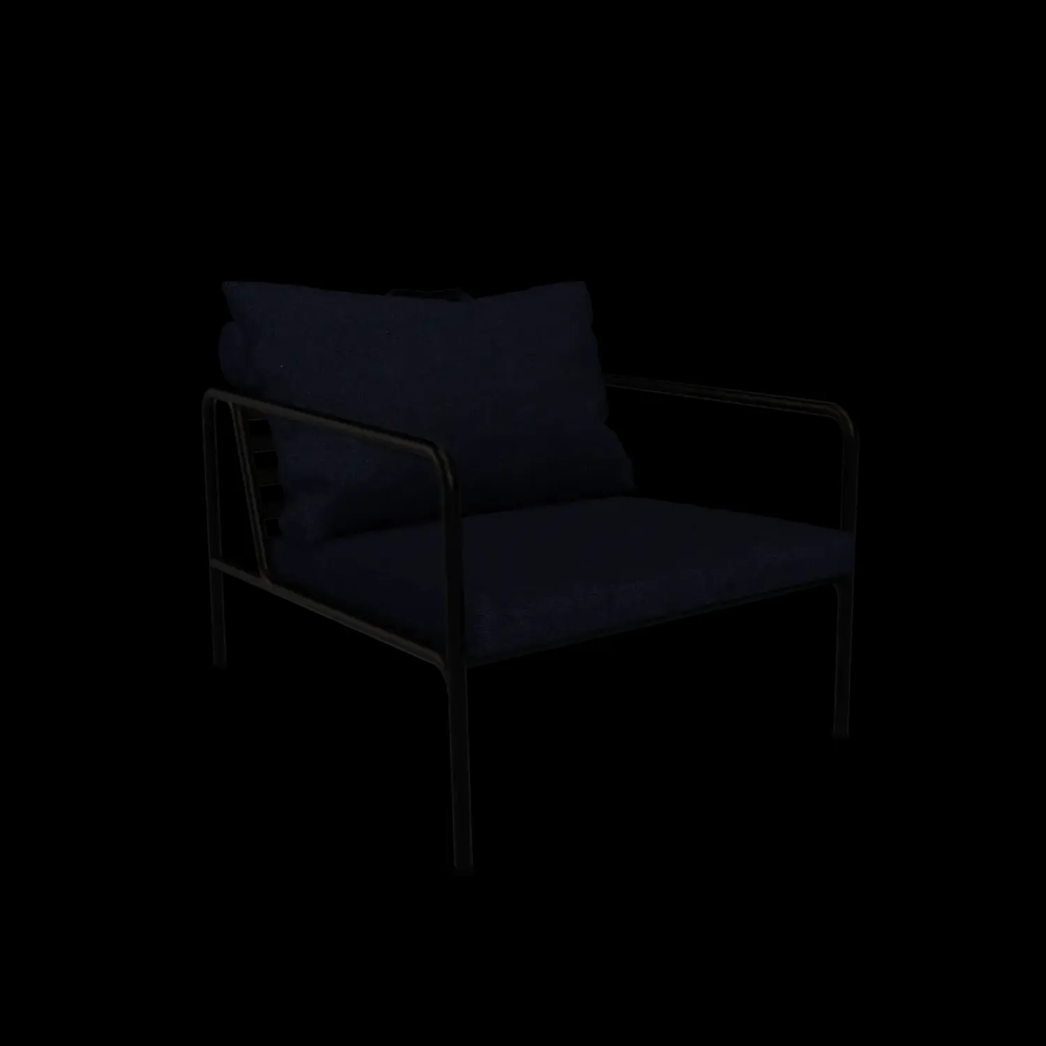 Udendørs loungestol med sort stålstel og indigo-farvede hynder i Sunbrella Heritage-stof. De lave, integrerede armlæn skaber en profil, der passer til både restauranter og hjem.