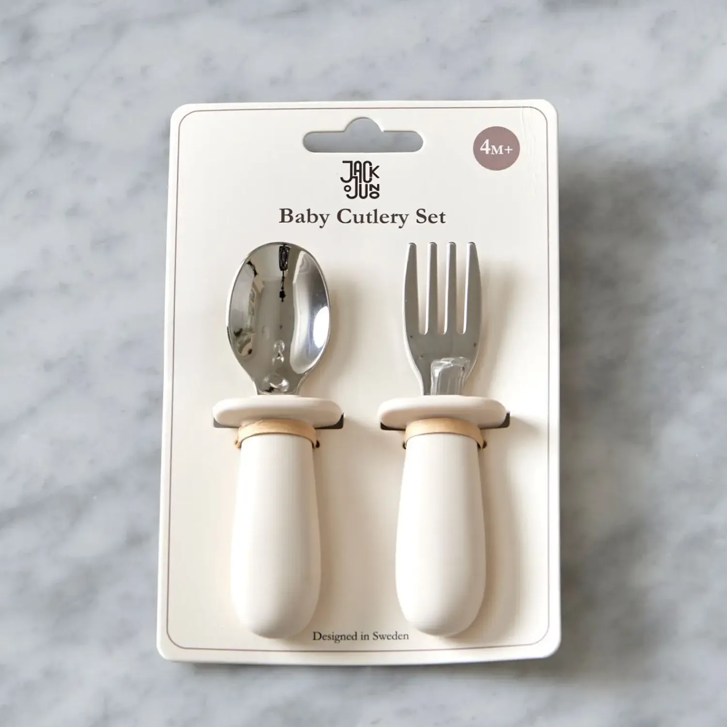 Jack o Juno – Baby Bestik Sæt – Cream er velegnet til babyer fra 4 måneder, når de begynder at udforske madens verden. Dette sæt er designet til at give babyer en behagelig introduktion til selvstændig spisning med fokus på sikkerhed og komfort. Med sin cremefarvede finish passer sættet godt ind i enhver spisesituation og gør måltidet til en visuel fornøjelse for både baby og forældre.