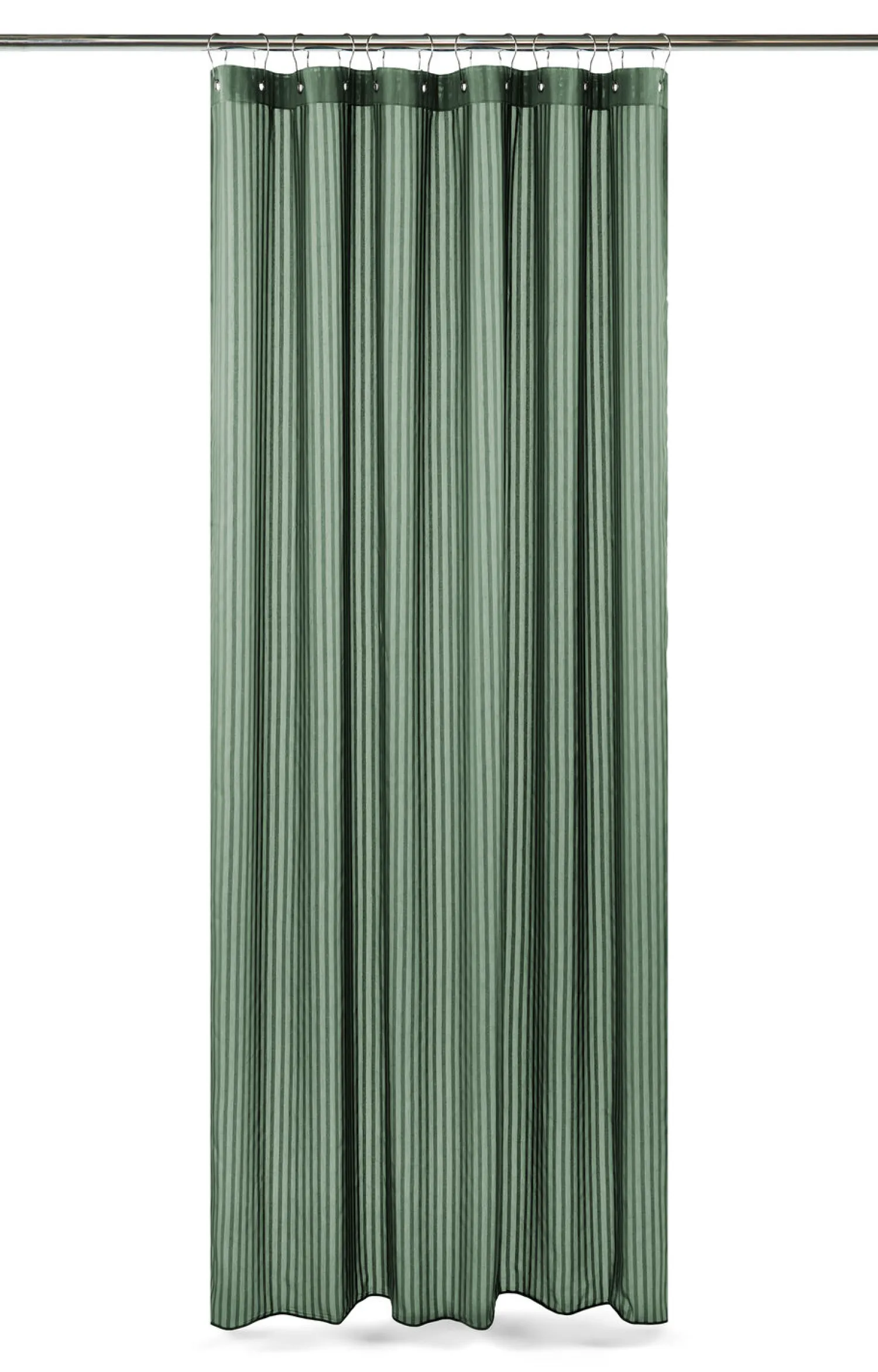 Dette badeforhæng i skovgrønne nuancer har et vævet stribemønster, der tilføjer dybde til dit badeværelse. De vertikale striber skaber en rolig stemning, mens det lækre stof sikrer god holdbarhed i hverdagen.