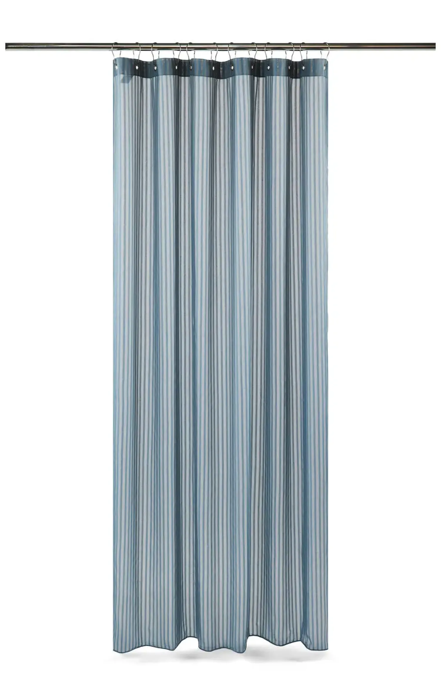 Dette badeforhæng i havblå nuancer bringer et roligt udtryk til dit badeværelse. De transparente tone-i-tone vævede striber skaber en let og luftig fornemmelse, der passer til forskellige indretningsstile.
