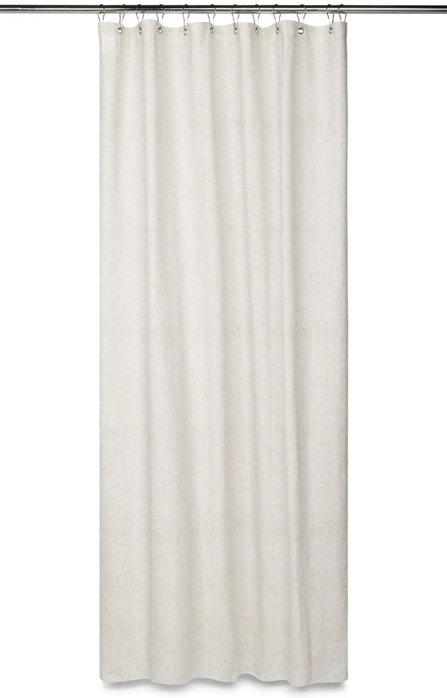 Dette badeforhæng i hør-look kombinerer praktisk funktionalitet med et naturligt udtryk. Det antibakterielle materiale sikrer et sundere badeværelsesmiljø, mens den diskrete vævede tekstur tilfører et roligt præg til rummet.