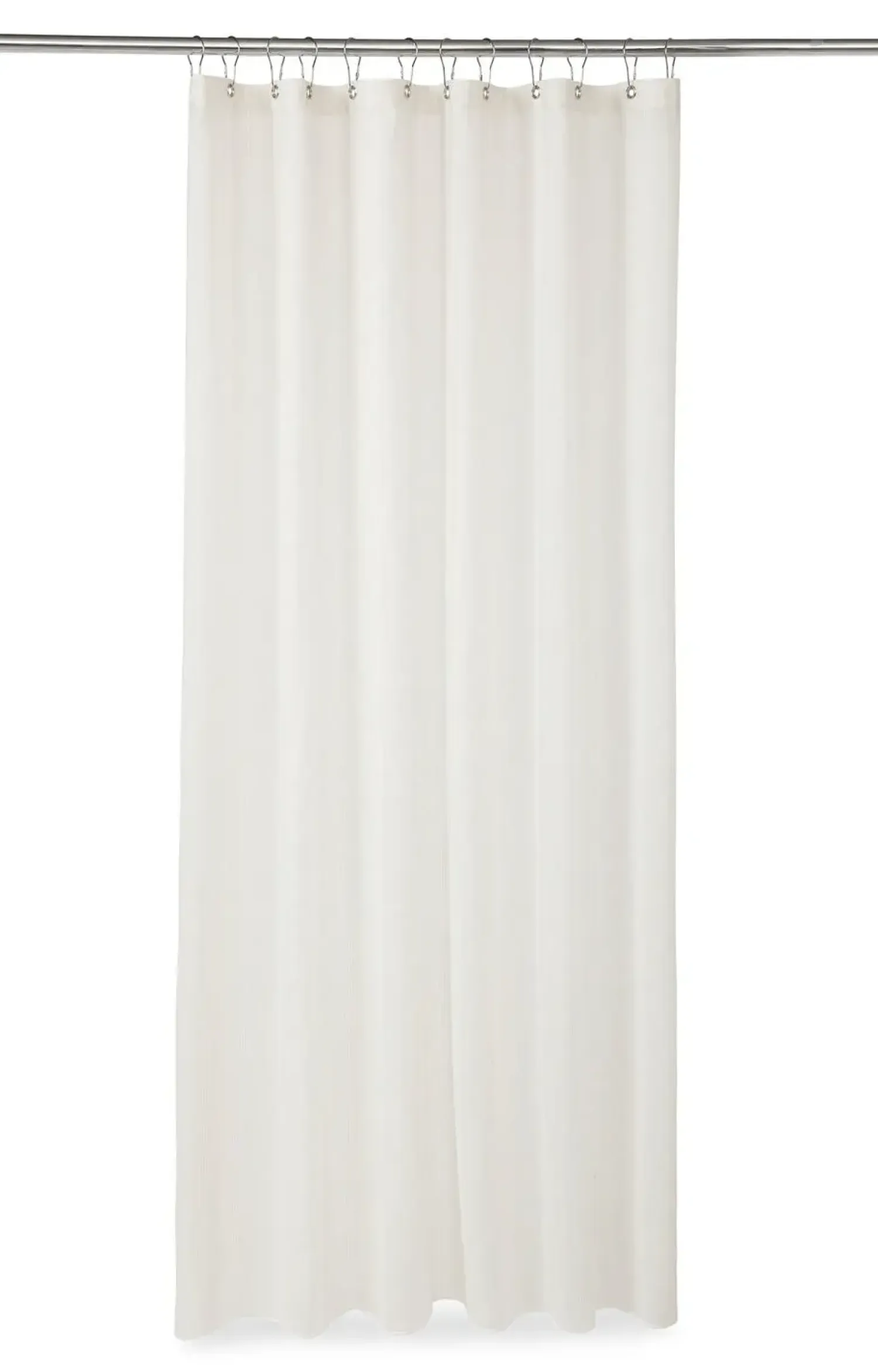 Det off-white stof med de vævede striber holder sig pænt i lang tid med den rette pleje. Hæng det til tørre efter brug, så det ikke samler fugt. De påmonterede ringe sikrer nem af- og påmontering, når forhænget skal vaskes.