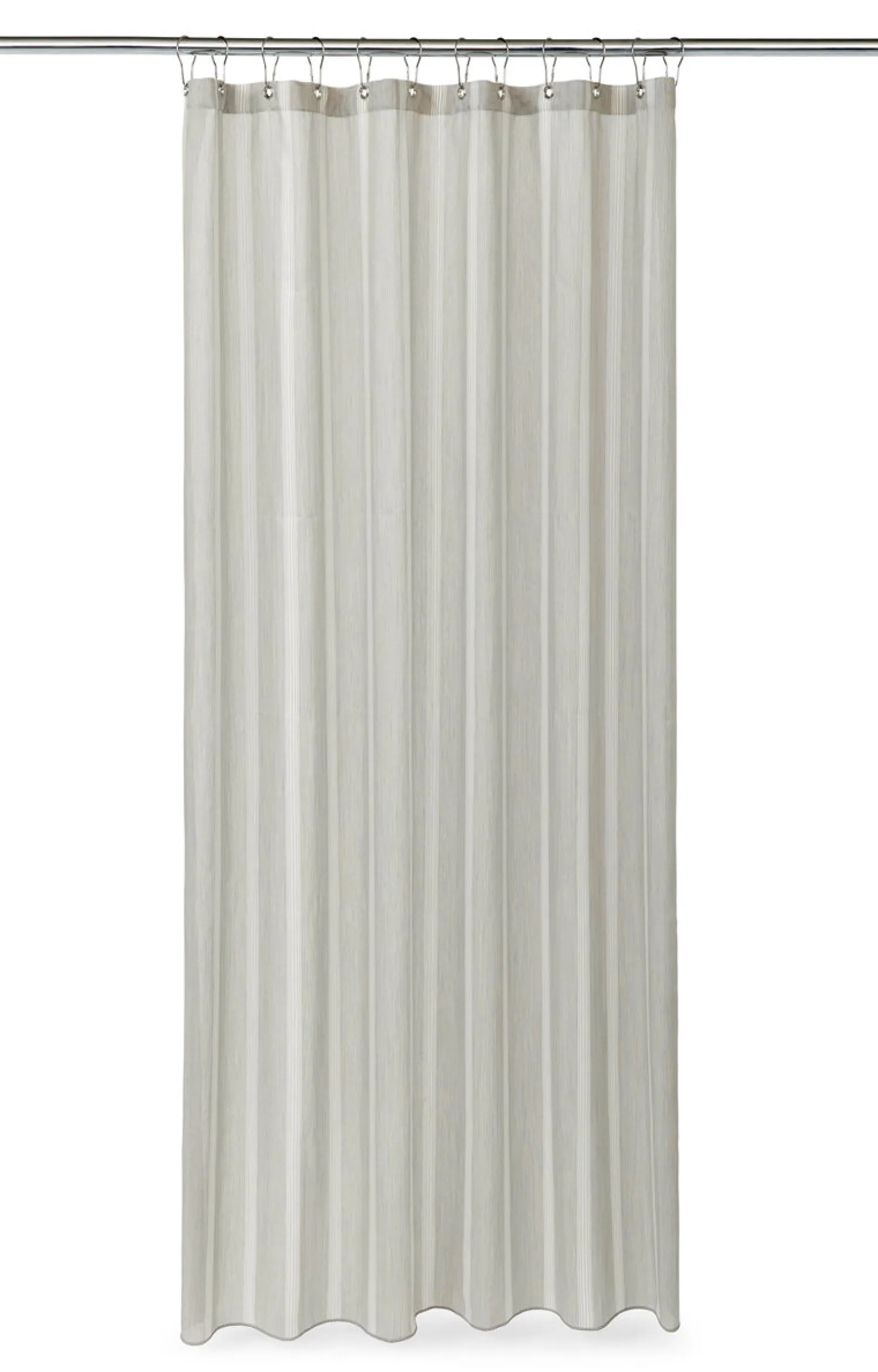 De lodrette striber i forskellige taupe nuancer giver dit badeværelse et roligt udtryk. Stoffets semi-transparente kvalitet balancerer mellem privatliv og lysgennemstrømning, så rummet føles både lyst og afskærmet på samme tid.