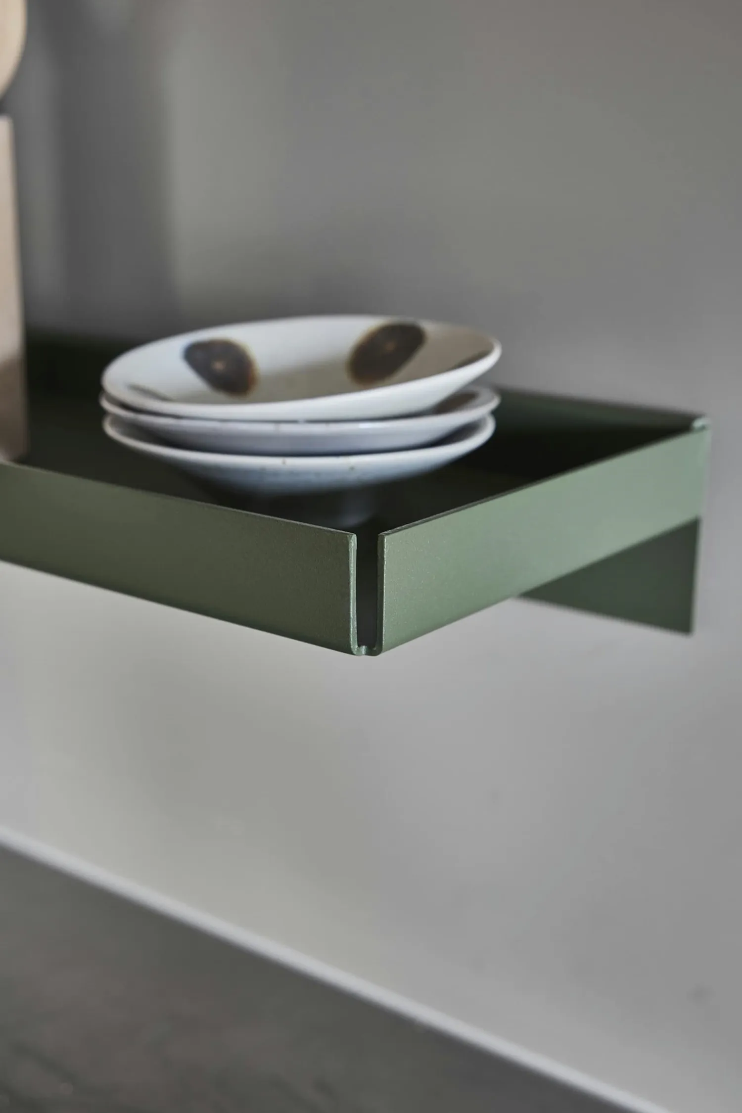 Bakku-hylden fra Oyoy er fremstillet af ét stykke bøjet stål, hvilket giver den et rent og minimalistisk udtryk. Den mørkegrønne farve tilfører et roligt element til din indretning, mens den enkle konstruktion uden samlinger sikrer en solid og holdbar løsning.