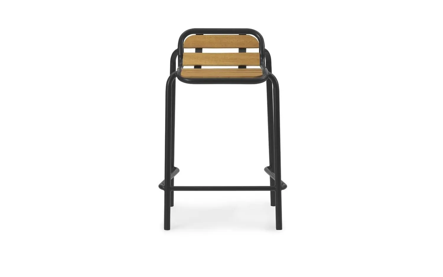 Det sorte stel og trælamellerne på sædet og ryglænet skaber en tidssvarende barstol, der passer naturligt ind i forskellige udendørsmiljøer. Stolen er bygget til at stå ude og bevare sit udtryk gennem årene.