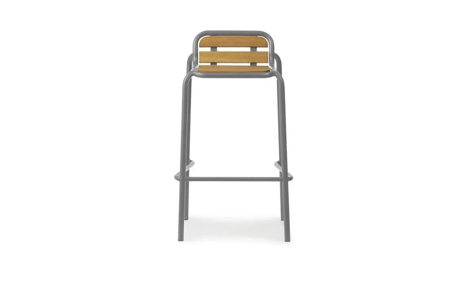 Barstol fremstillet i dobbelt pulverlakeret stål og olieret robiniatræ, der sikrer holdbarhed i alle vejrforhold. Med en sædehøjde på 75 cm og indbygget fodstøtte får du en komfortabel siddeplads til udendørs brug.