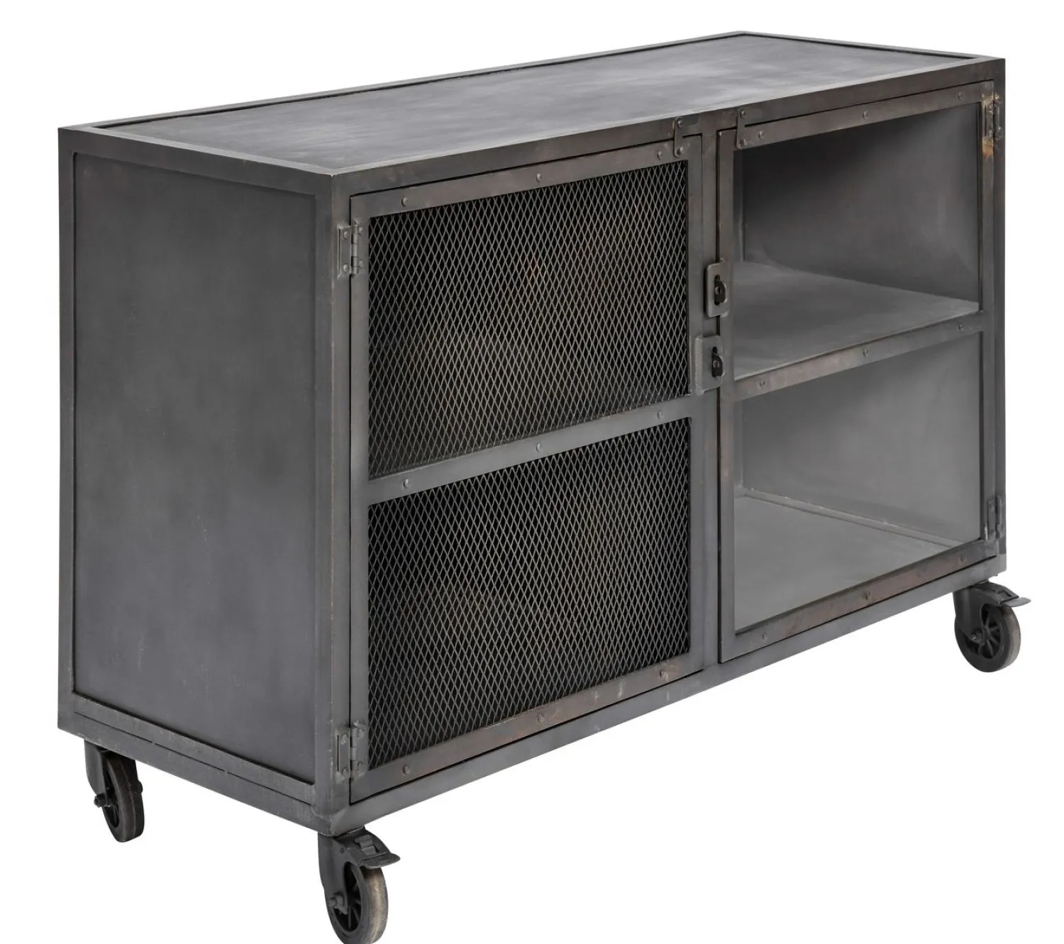 Barskab 21 er designet med fokus på praktisk anvendelse. De fire hjul gør det nemt at flytte skabet, så du kan placere det efter behov, hvad enten det er i stuen, køkkenet eller hjemmekontoret. Jernkonstruktionen giver skabet holdbarhed og en distinkt visuel profil, der kan passe ind i forskellige indretningsstile.
