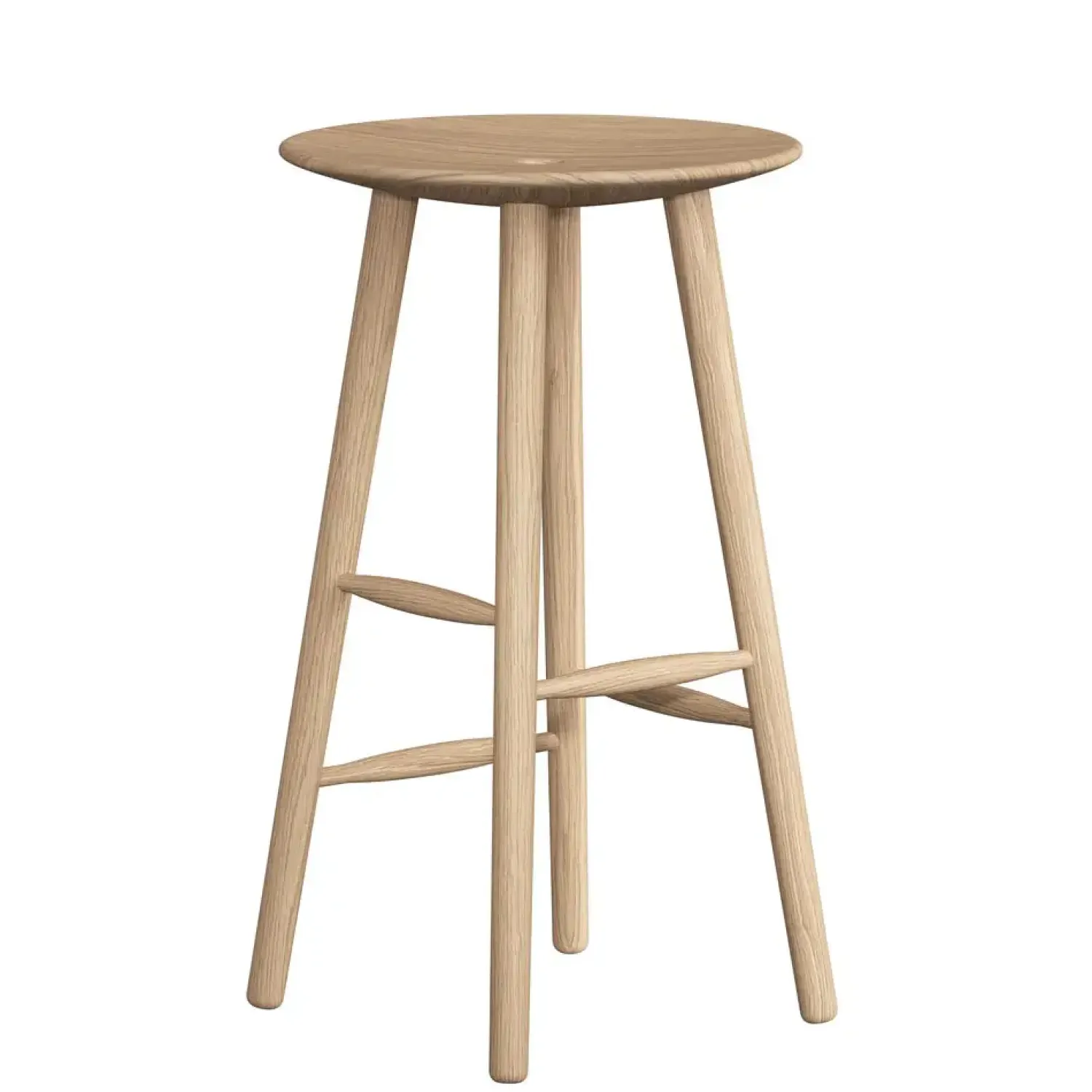 Barstolen har et stort, let buet sæde med et centerhul, som gør det nemt at tage fat i skamlen og flytte den – og takket være det slanke og elegante design er barstolen let.