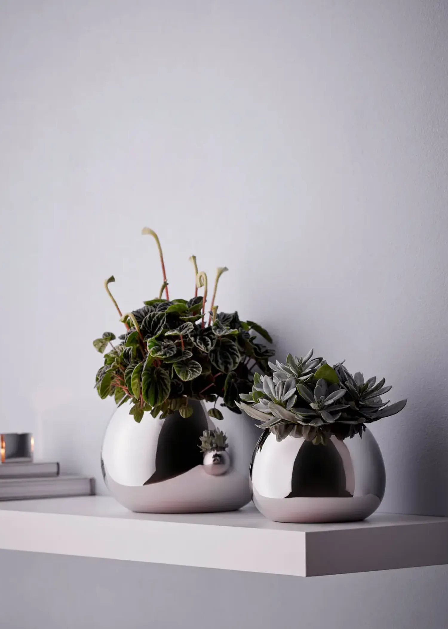 Bella vasens polerede overflade skaber en reflekterende finish, der spiller med lyset og beskytter mod direkte sollys. Den rustfrie stålkonstruktion giver et moderne udseende og er nem at vedligeholde. Denne elegante finish fremhæver både friske og tørrede blomsterarrangementer.