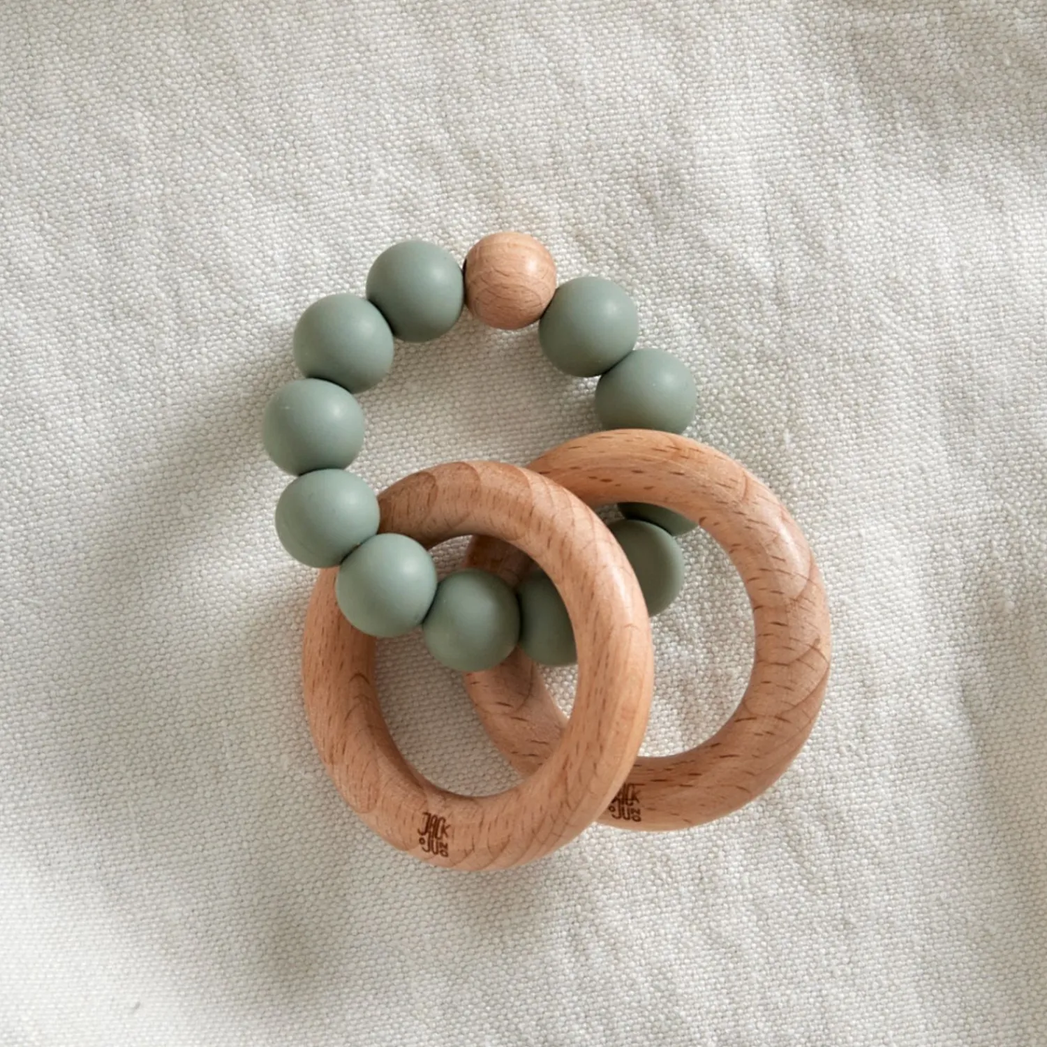 Bideringen kombinerer runde perler og træ-ringe for at give forskellige teksturer og et nemt greb. Den fleksible struktur giver barnet mulighed for at udforske forskellige overflader. Designet er både funktionelt og æstetisk tiltalende med sin grønne farve og naturlige træelementer.