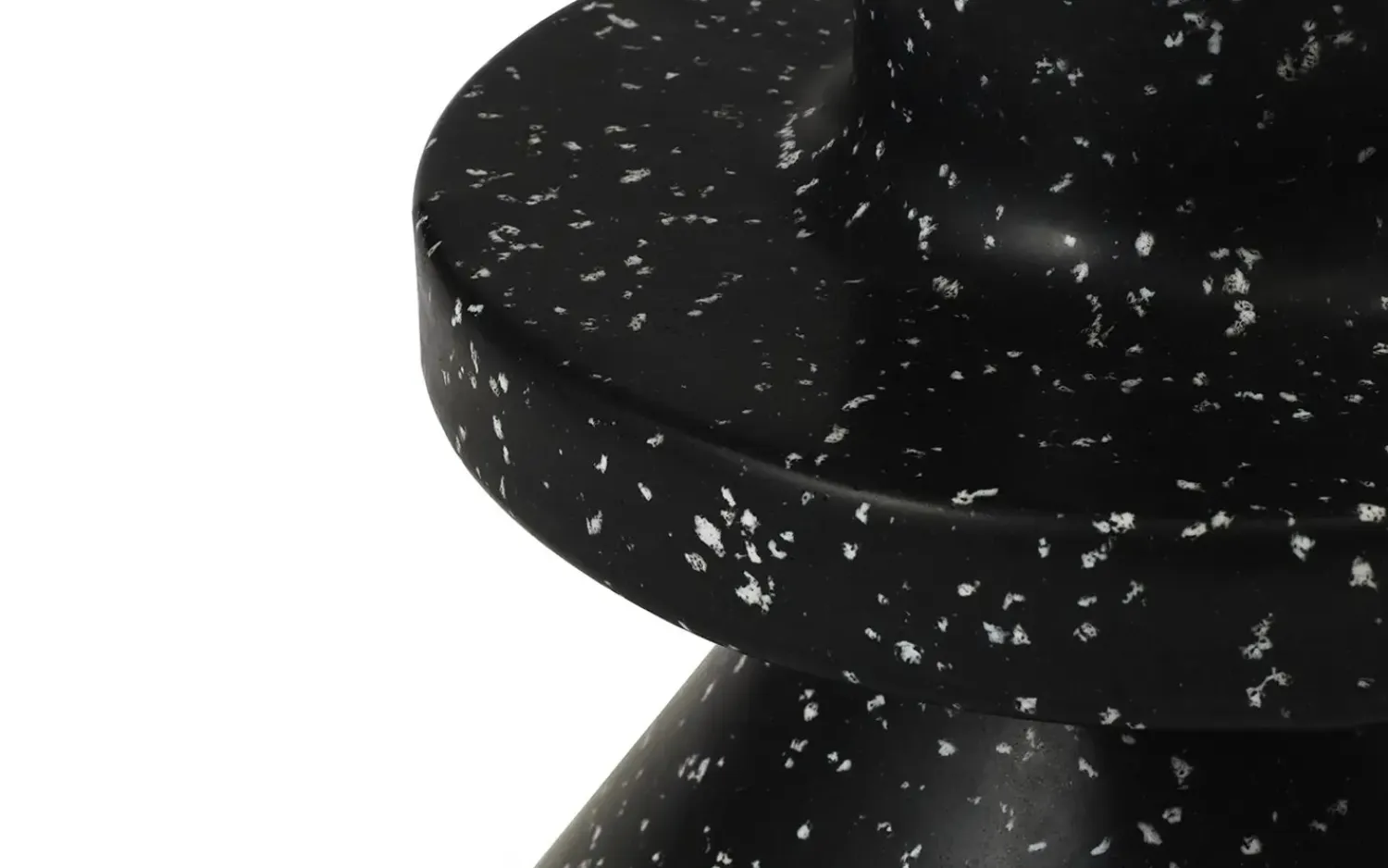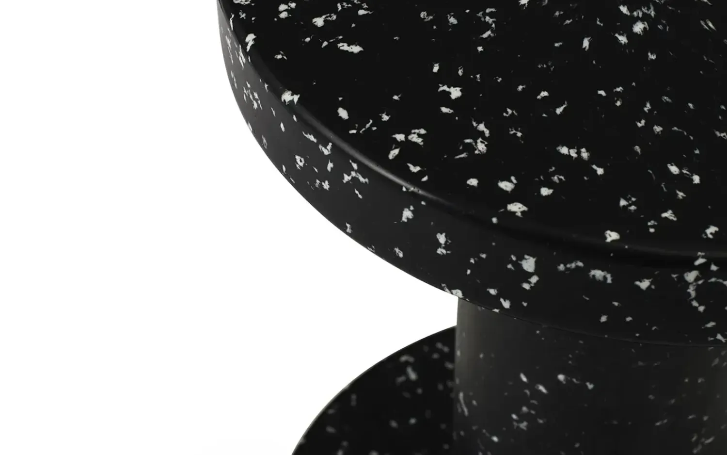 Med en base af genanvendte materialer bidrager du til en mere bæredygtig møbelproduktion. Den sorte overflade med det karakteristiske spættede mønster er resultatet af den miljøvenlige fremstillingsproces.
