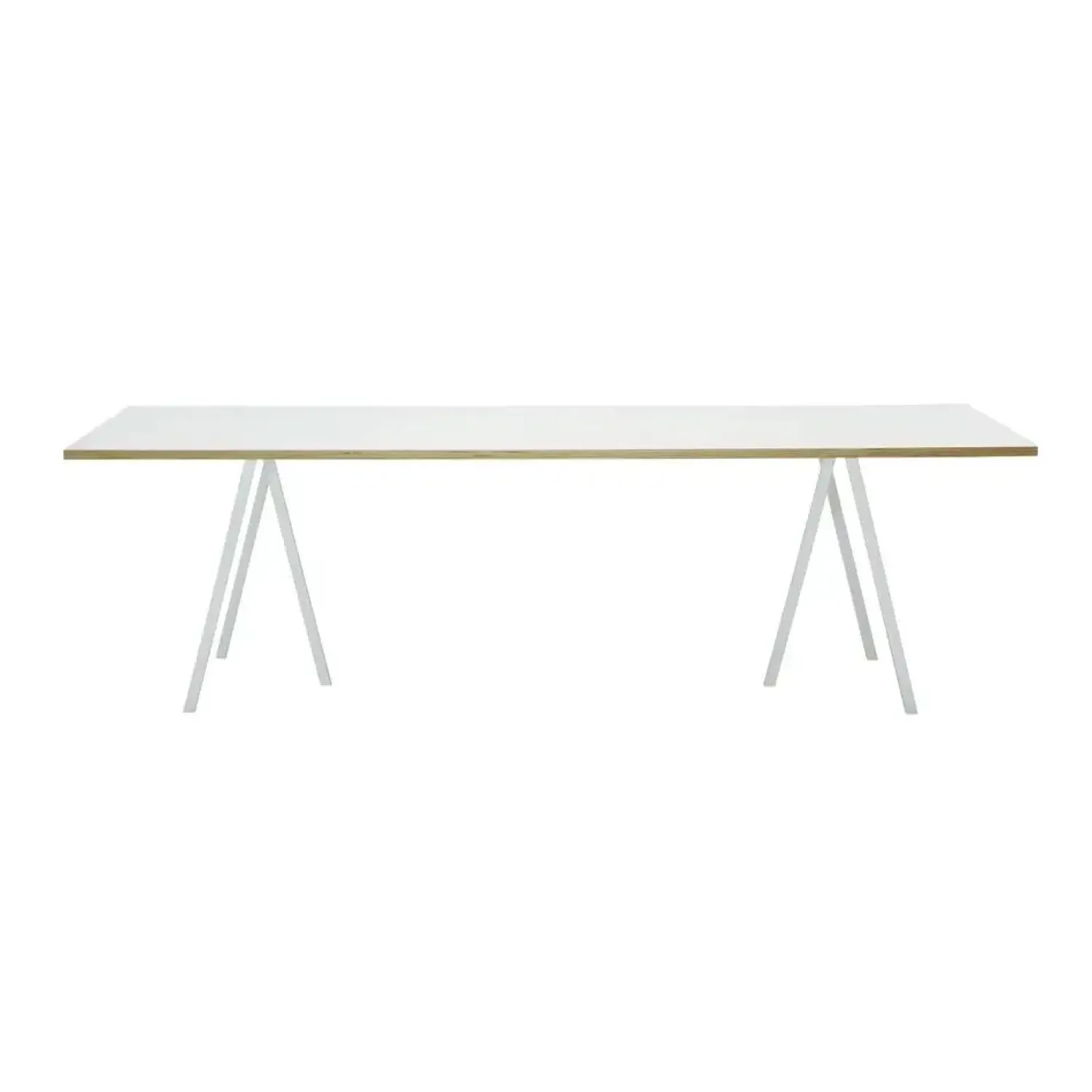 Materiale: bordplade hvid laminat med krydsfiner kant, ben i lakeret jern