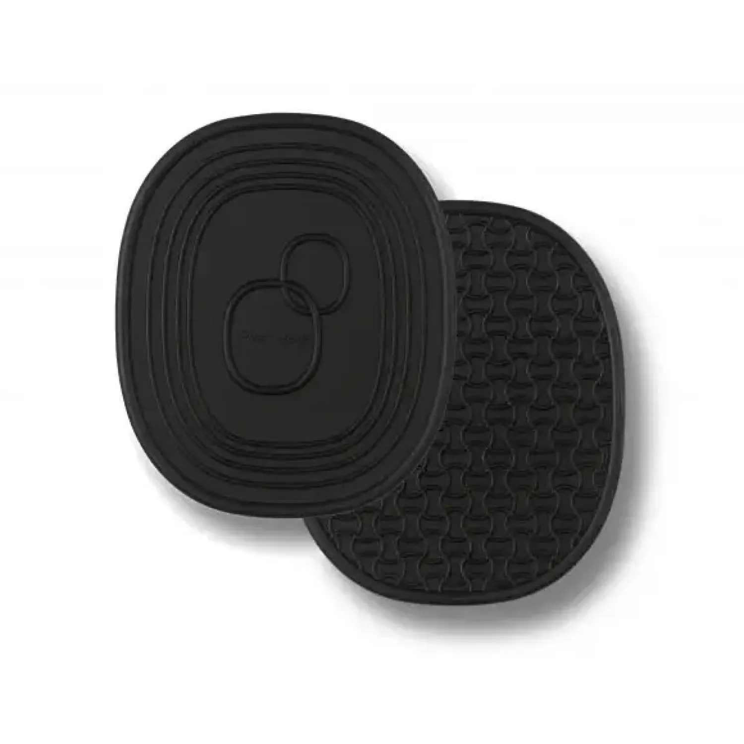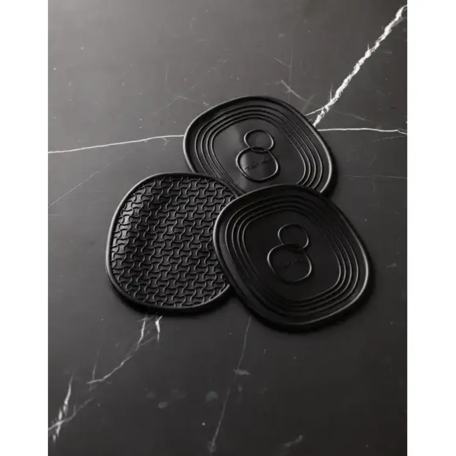 Piet Heins moderne superellipse formet bordskåner er udført i fleksibelt, skridsikkert sort silikone og kan tåle op til 230 grader C.
