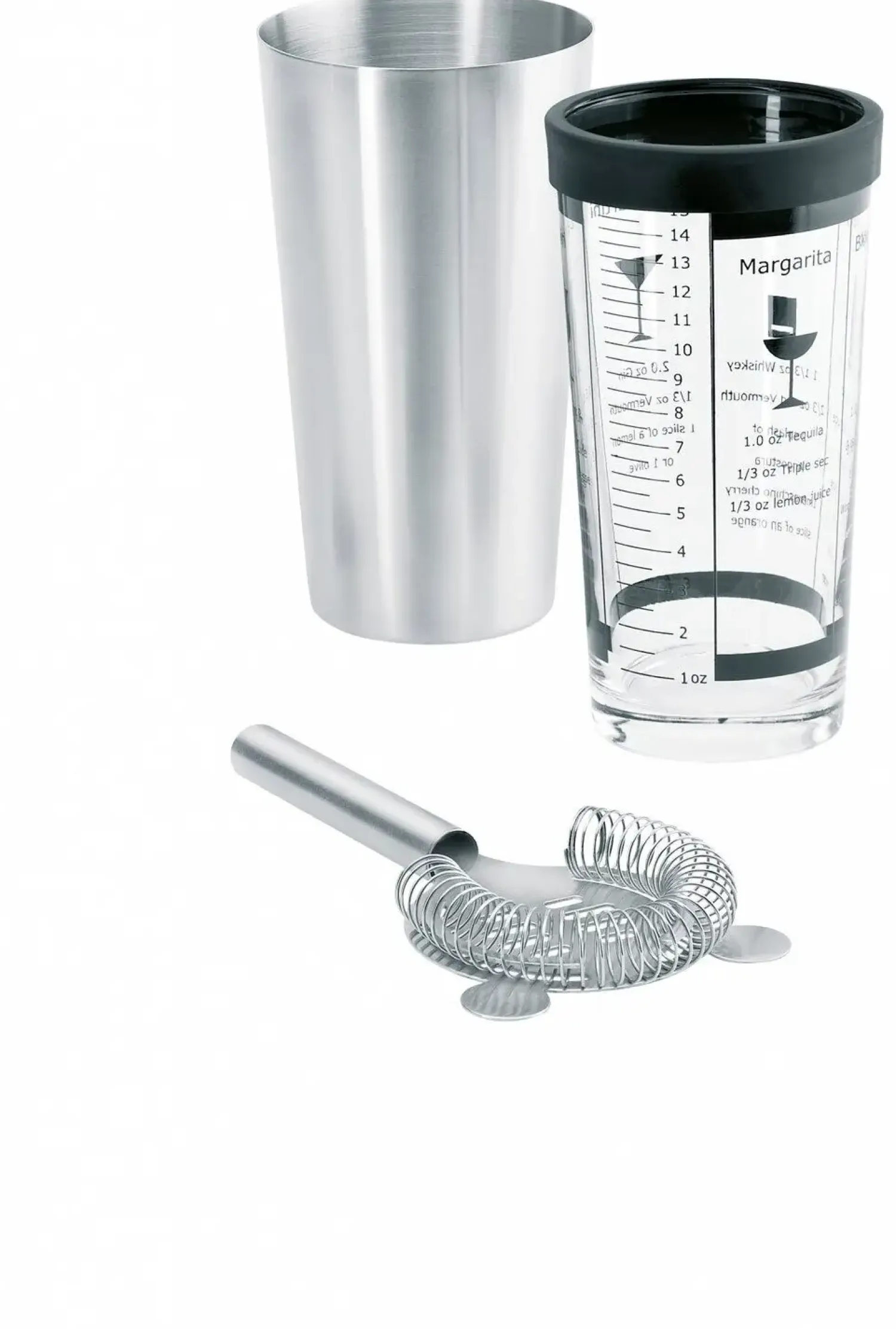 Super fint og stilrent shaker sæt med alt hvad du behøver til hjemmebaren. Shaker sættet indeholder et metal bægerglas, blandingsglas og en si. På bægerglasset er der markeret forskellige mængder, så du præcis kan måle de ingredienser du nu skal bruge til at lave den helt perfekte drink.