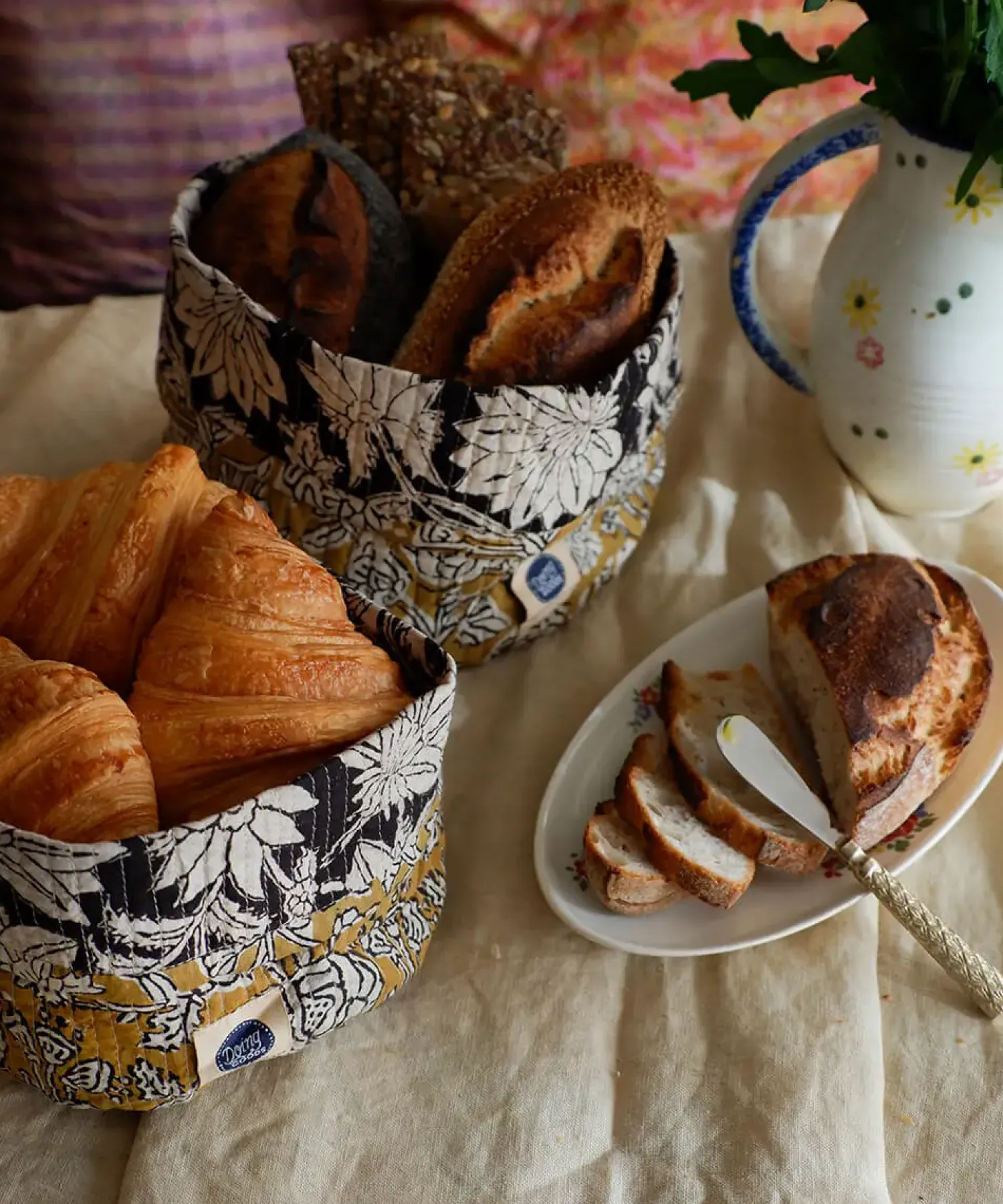 Mød vores Botaniske Stofkurvesæt, et multifunktionelt sæt på to kurve af 100% bomuld, der er bloktrykt i hånden og vendbare for dobbelt så meget sjov! Brug dem som brødkurv til en langsom søndagsmorgenmad eller hold dem på din toilettafel for at holde dine skønhedsprodukter sikre. På grund af den håndlavede karakter af dette produkt kan du forvente let variation i dets udseende.