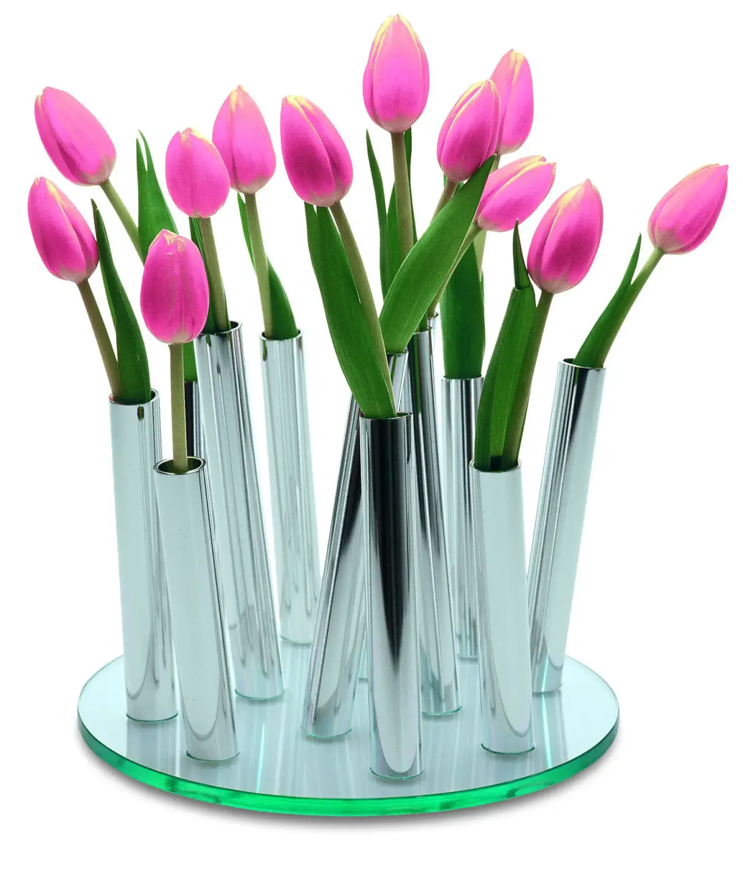 Bouquet-vasen kombinerer glas og poleret aluminium i en harmonisk komposition. De vertikale, rørformede elementer i varierende højder skaber et interessant visuelt udtryk, mens den polerede overflade bidrager til vasens elegante fremtoning.