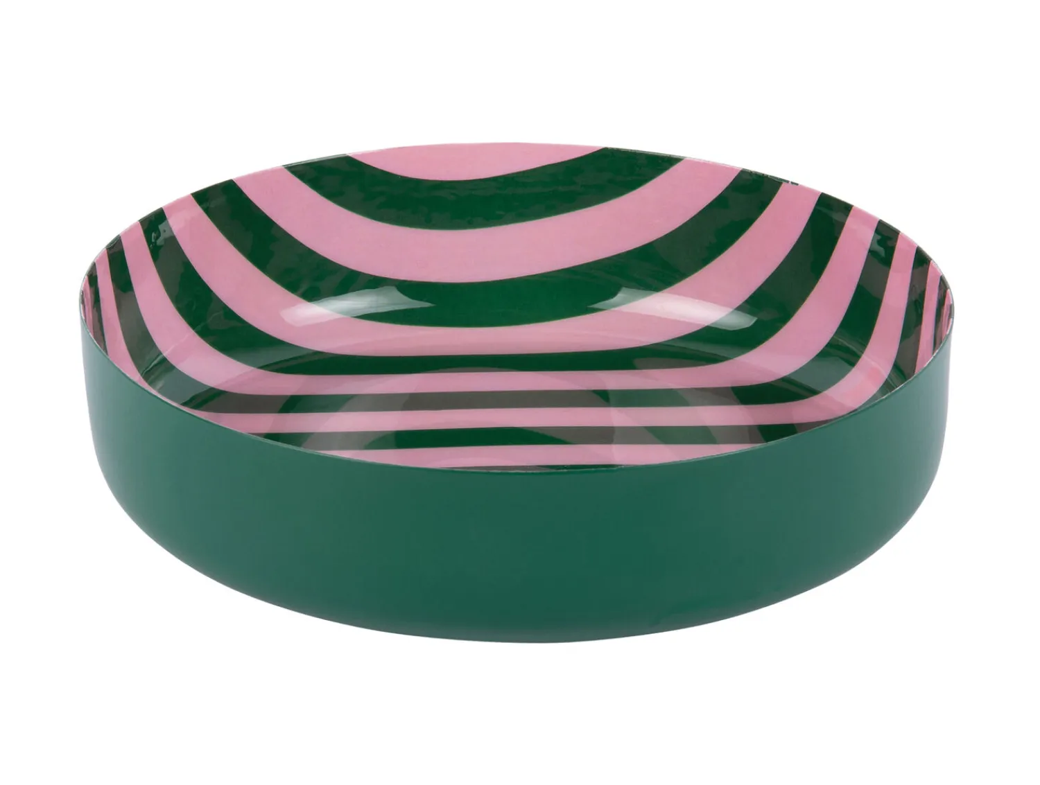 Denne skål fanger essensen af retrodesign med sin markante grønne ydre farve og det indvendige mønster af grønne og lyserøde striber. Lavet af jern giver den en robust og holdbar kvalitet, der kan holde til daglig brug.