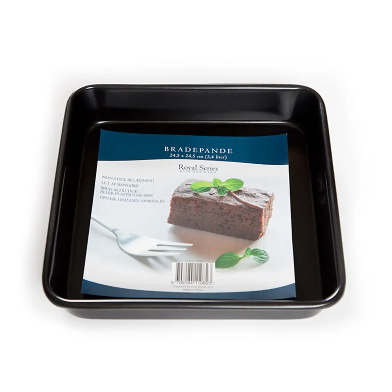 Denne kvadratiske bradepande i stål har en overflade, der forhindrer mad i at brænde fast. Den er god til mindre portioner. De høje kanter og målene på 24,5 x 24,5 cm gør den velegnet til gratiner og lasagne.