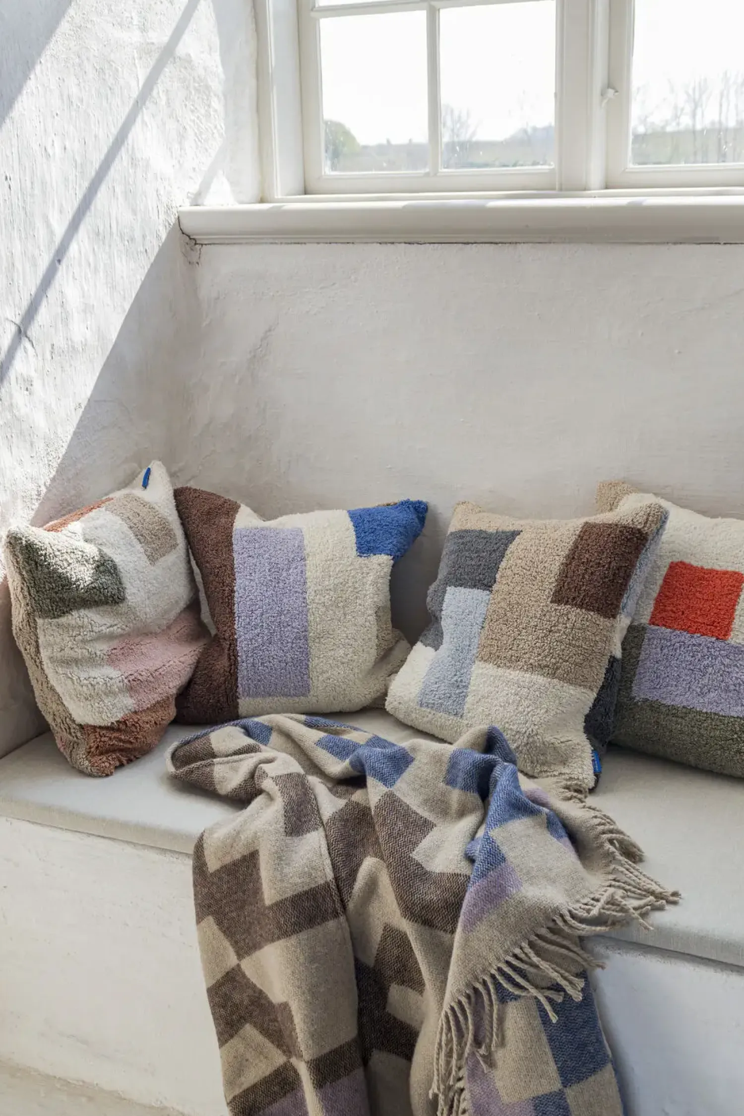 Med sit indbydende look giver BRICK-pudebetrækket fra Mette Ditmer en unik karakter til ethvert rum. Hver detalje er nøje overvejet på både for- og bagsiden, som præsenterer en smuk kombination af brun, lyslilla, sandfarvet, råhvid og kobolt. Dette giver forskellige udtryk afhængigt af, hvilken side der er synlig.