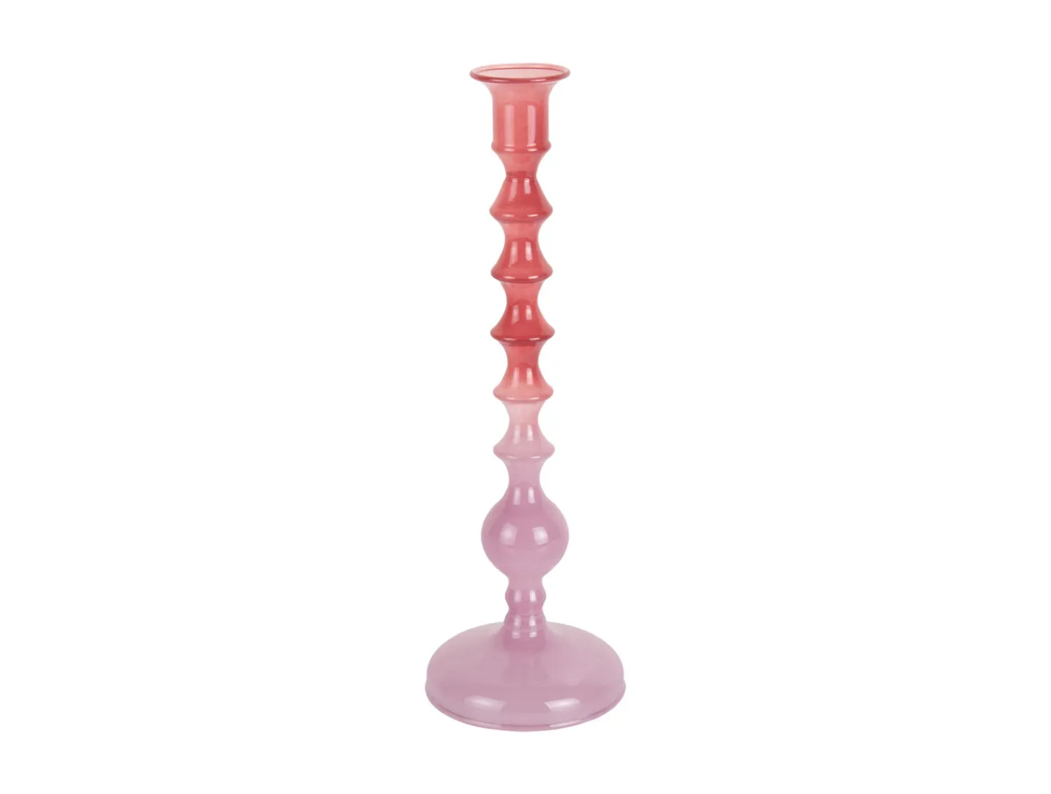 Denne lysestage fra Present Time skiller sig ud med sin farvegradient, der går fra varm lilla øverst til blød lilla nederst. Stammen har bulbøse segmenter, der skaber et dekorativt udtryk, og den slanke form giver visuel interesse til dit rum.
