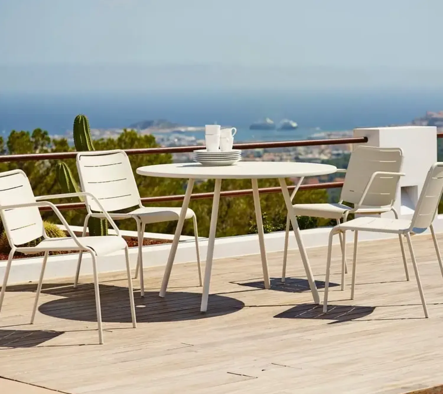 Copenhagen spisestol er lavet i pulverlakeret aluminium, er vejrbestandig og fremstilles både med og uden armlæn.