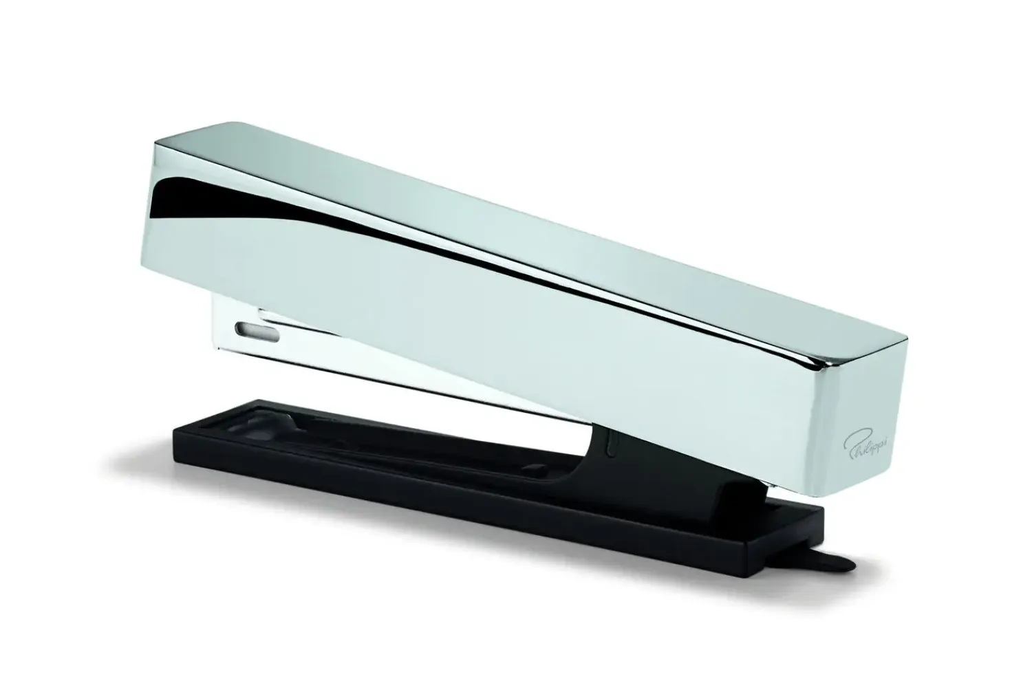 Hæftepistolen fra Philippi, designet af Andreas Ostwald, kombinerer moderne æstetik med praktisk funktionalitet. Med en skinnende sølvfarve og et minimalistisk design passer den ideelt ind i ethvert kontormiljø. Fremstillet af metal tilbyder den en robust og kvalitetspræget følelse. Dens spejlpolerede overflade og matte sorte detaljer giver et professionelt og elegant udtryk.