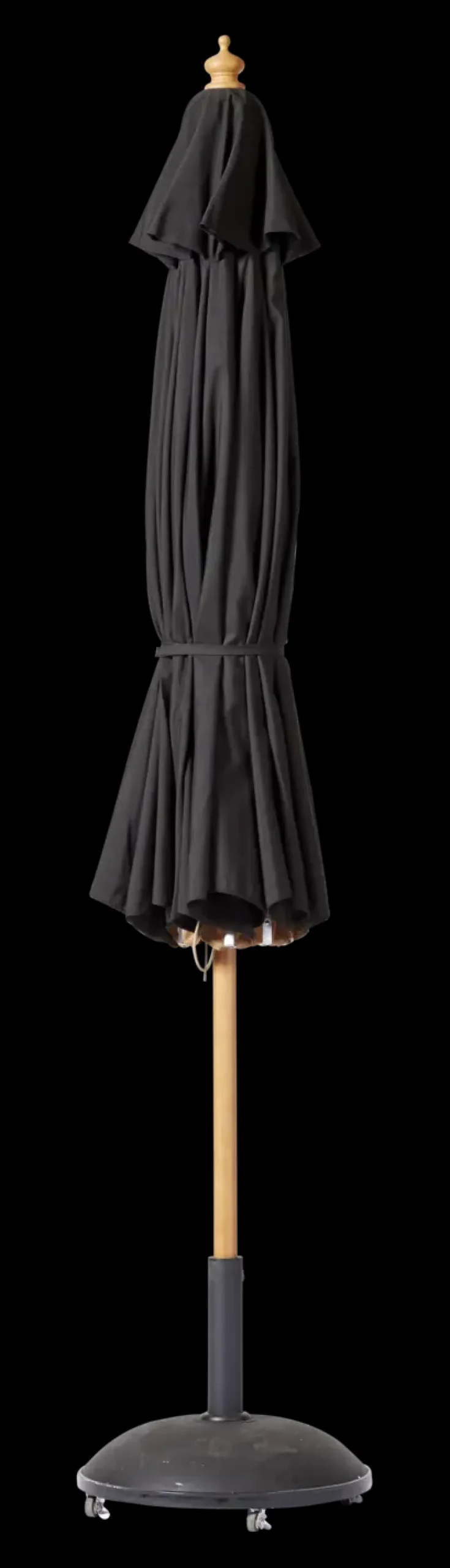 Capri-parasollen er konstrueret med fokus på funktionalitet. Den teakfarvede træstang giver støtte, mens den sorte polyesterdug dækker et område på 3 meter i diameter. Detaljer som L-clips og læderlapper bidrager til parasollens udseende.