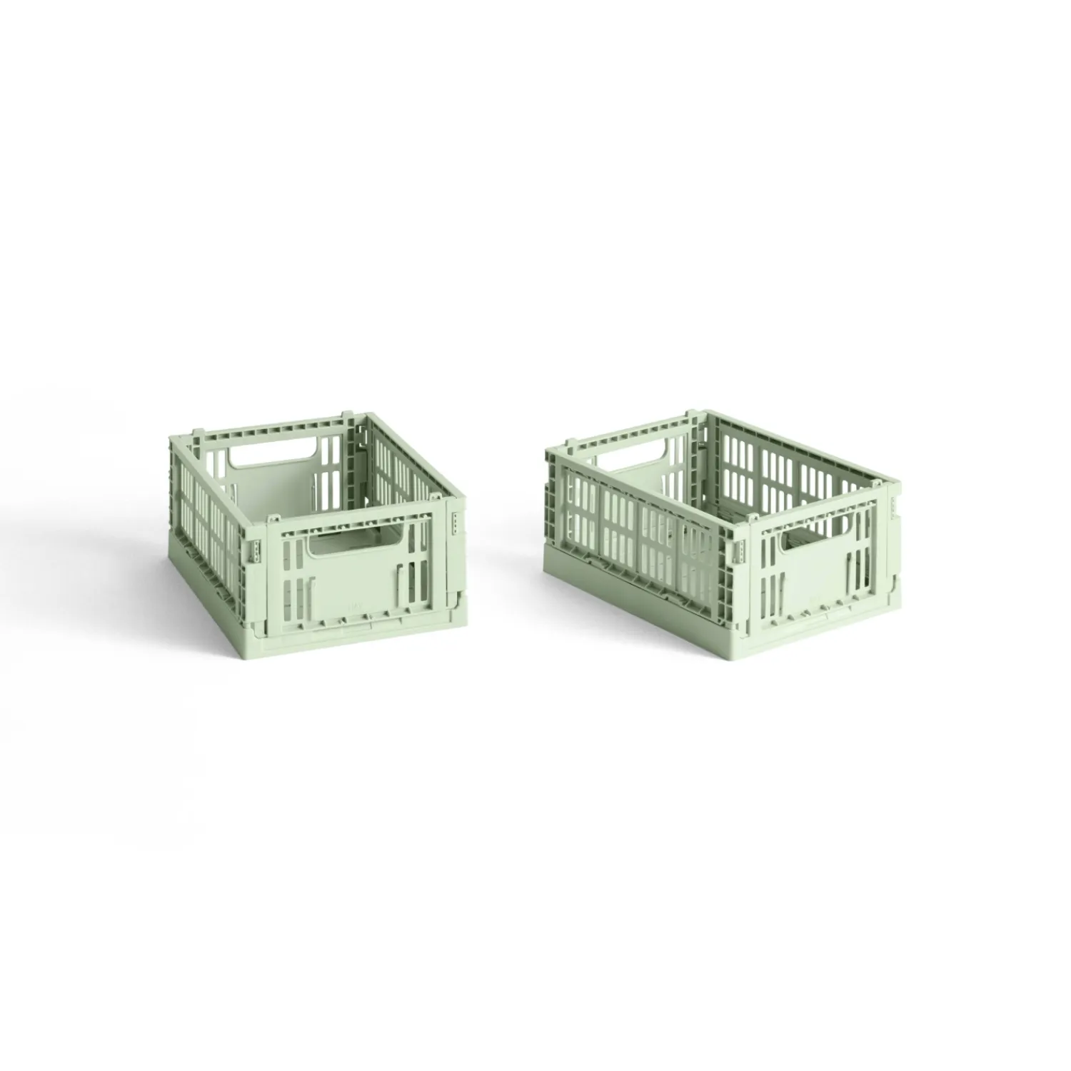Praktiske mini opbevaringskasser i mintgrøn fra HAY, der kommer i et sæt med to stykker. Kasserne er fremstillet af 100% genanvendt plastik fra husholdningsaffald og passer ideelt ind i de større kasser fra HAY Colour Kasser serien. Det gennemtænkte, perforerede design sikrer god luftcirkulation og giver dig mulighed for at skabe dit eget organisationssystem.