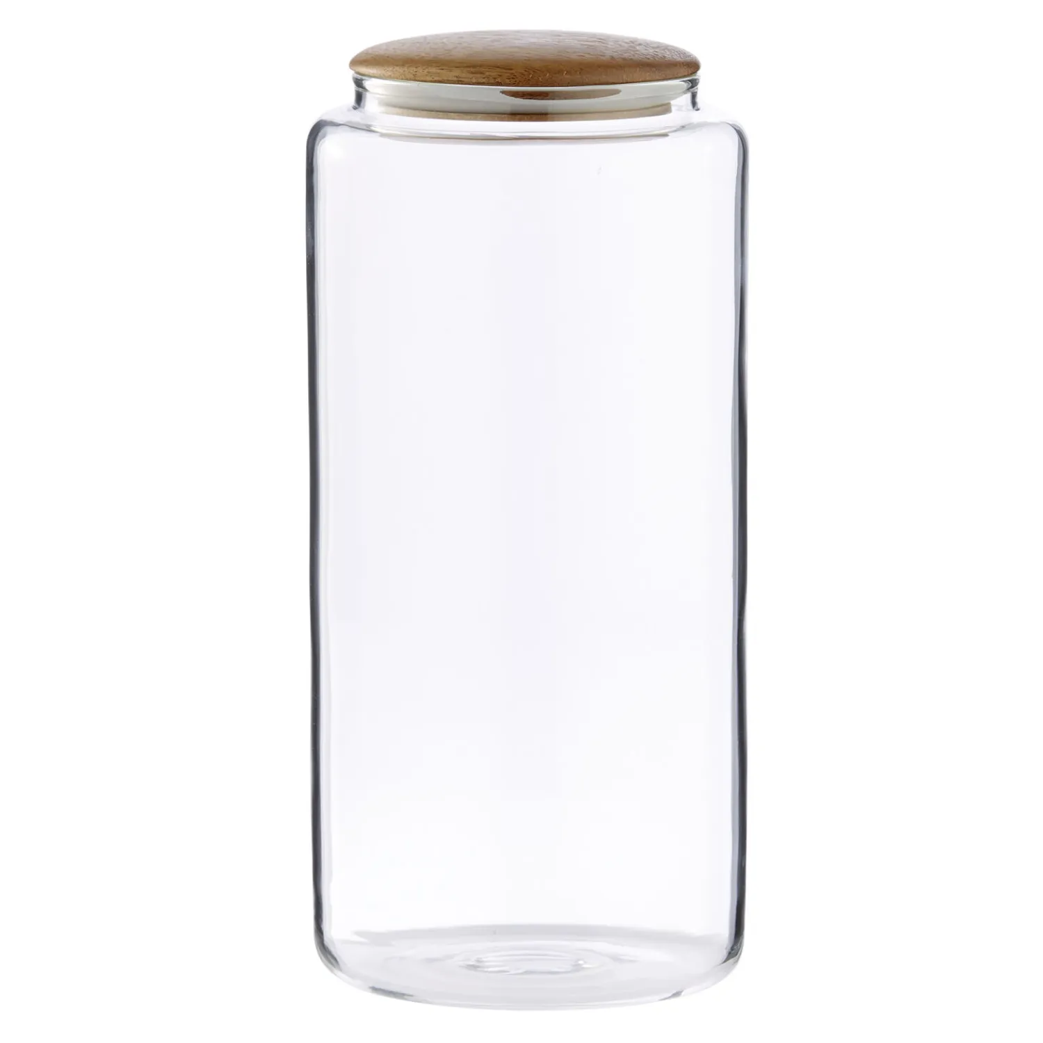Enkel transparent krukke i glas med låg af acacietræ i farven natur.