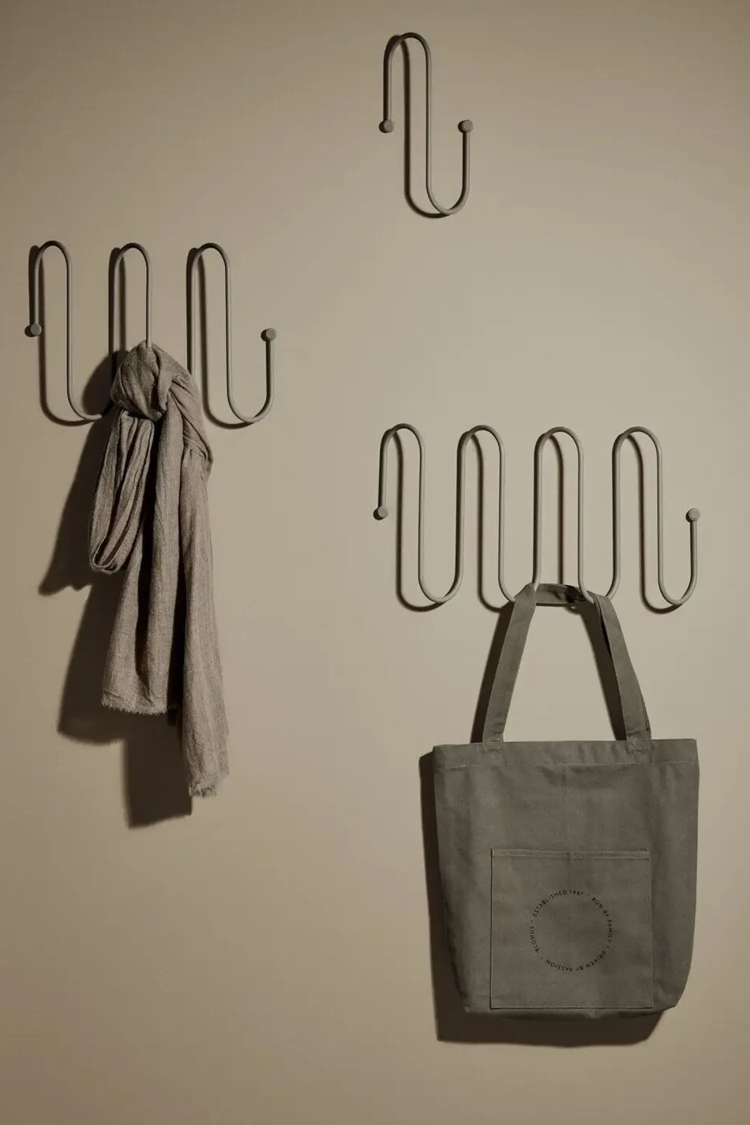 Fed knage fra blomus. Den nederste kurve kan bruges til at hænge frakker eller tørklæder på, mens den øvre kurve kan bruges til hoodies, hætter eller poser. Belægningen kan vægmonteres ved hjælp af to runde stop med magnetisk afdækning (monteringsmateriale inkluderet i levering)
