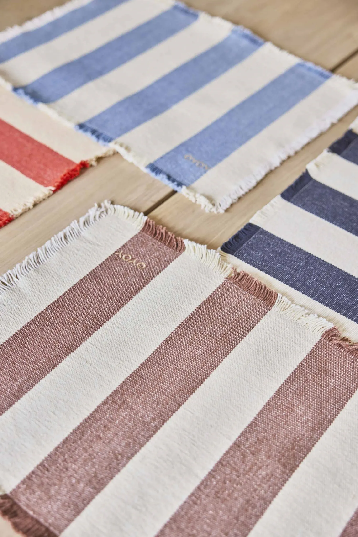 Du får et sæt med to matchende dækkeservietter i 100 % økologisk bomuld. De karakteristiske striber i lyseblå og beige skaber en rolig bordopdækning, mens frynserne tilfører et diskret designelement.