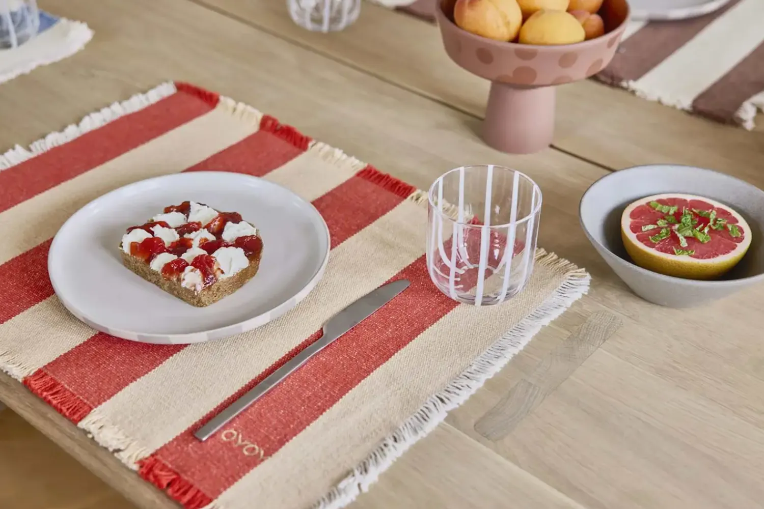 De røde og beige striber skaber et moderne udtryk, der nemt kan matches med forskelligt service. Stribemønsteret giver dine bordopdækninger et ensartet og gennemført look, uanset om det er til hverdag eller fest.