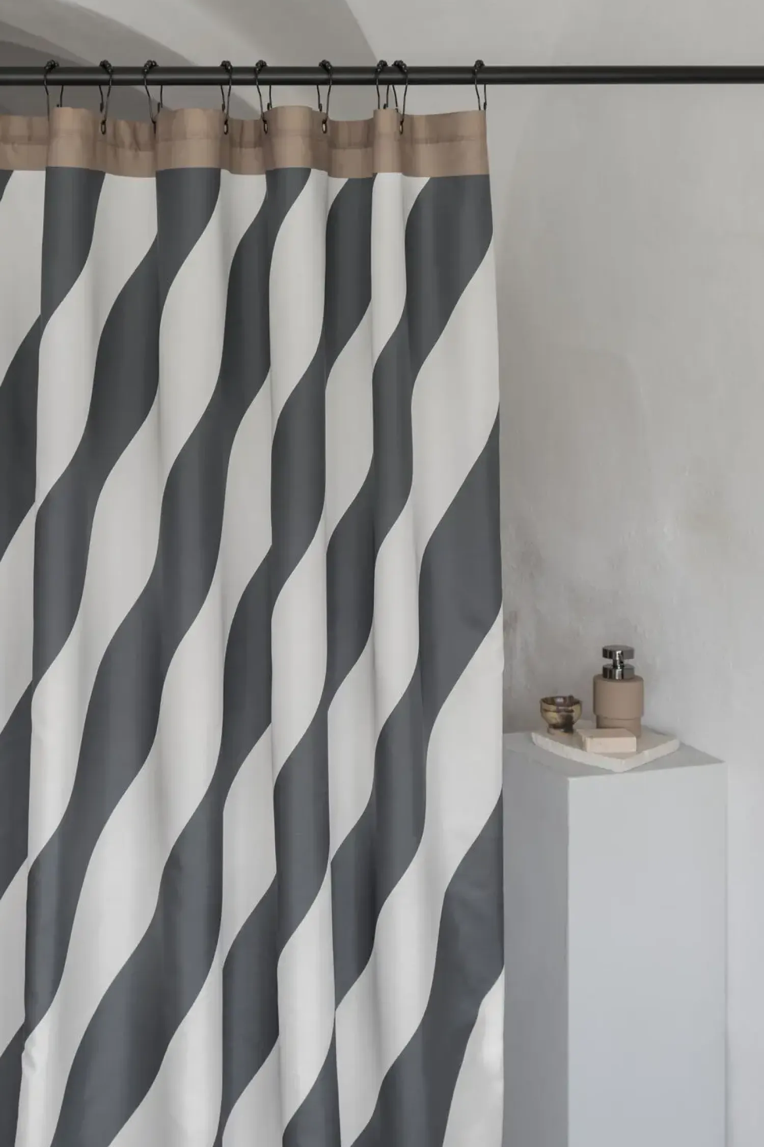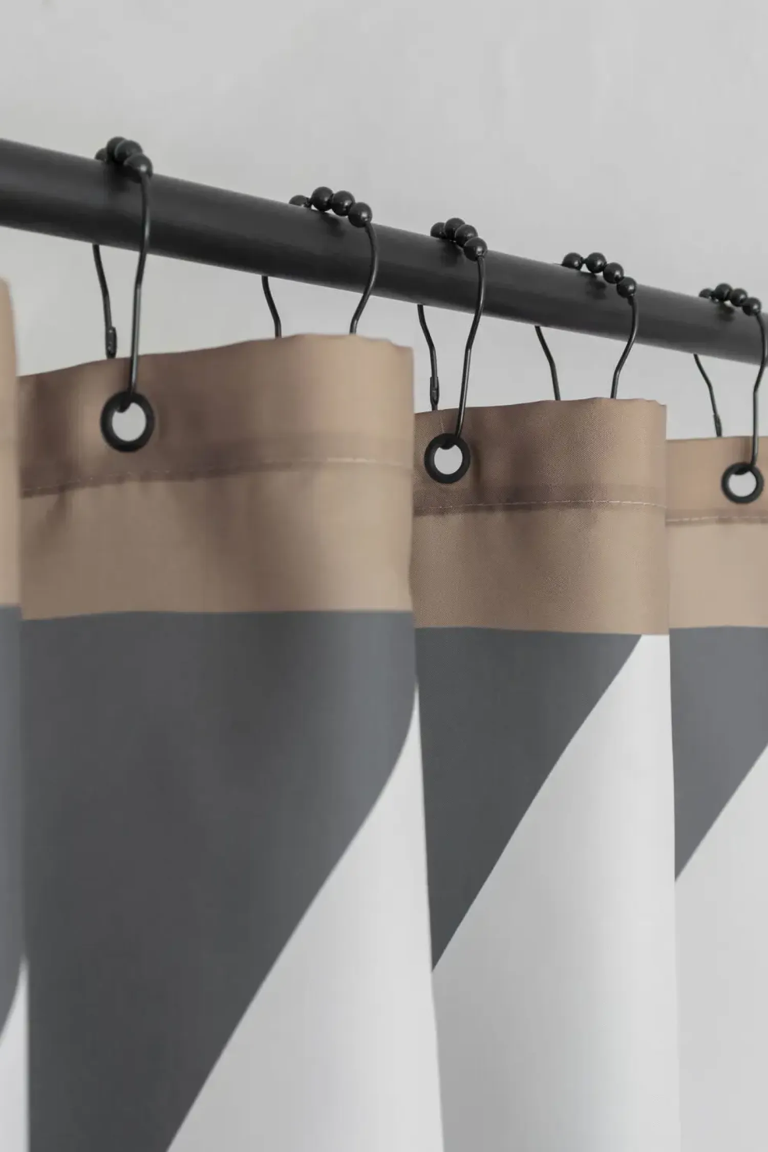 Giv dit badeværelse et moderne løft med DIAGONAL-badeforhænget, der fremhæver både funktionalitet og grafisk design. Dette elegante forhæng er udsmykket med mørkegrå og off-white diagonale striber, komplementeret af en flot lysebrun bort. De sorte metalringe i borten sikrer enkel ophængning.