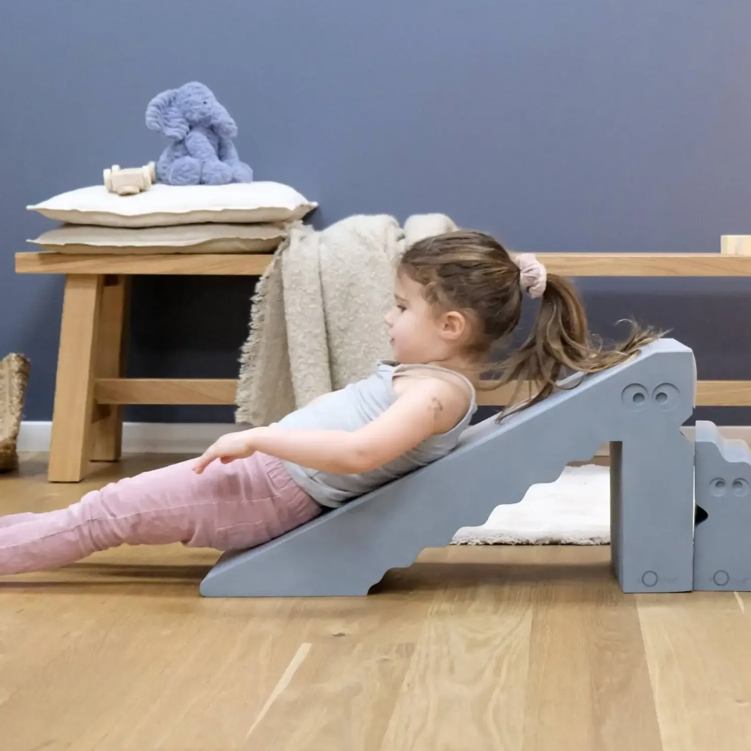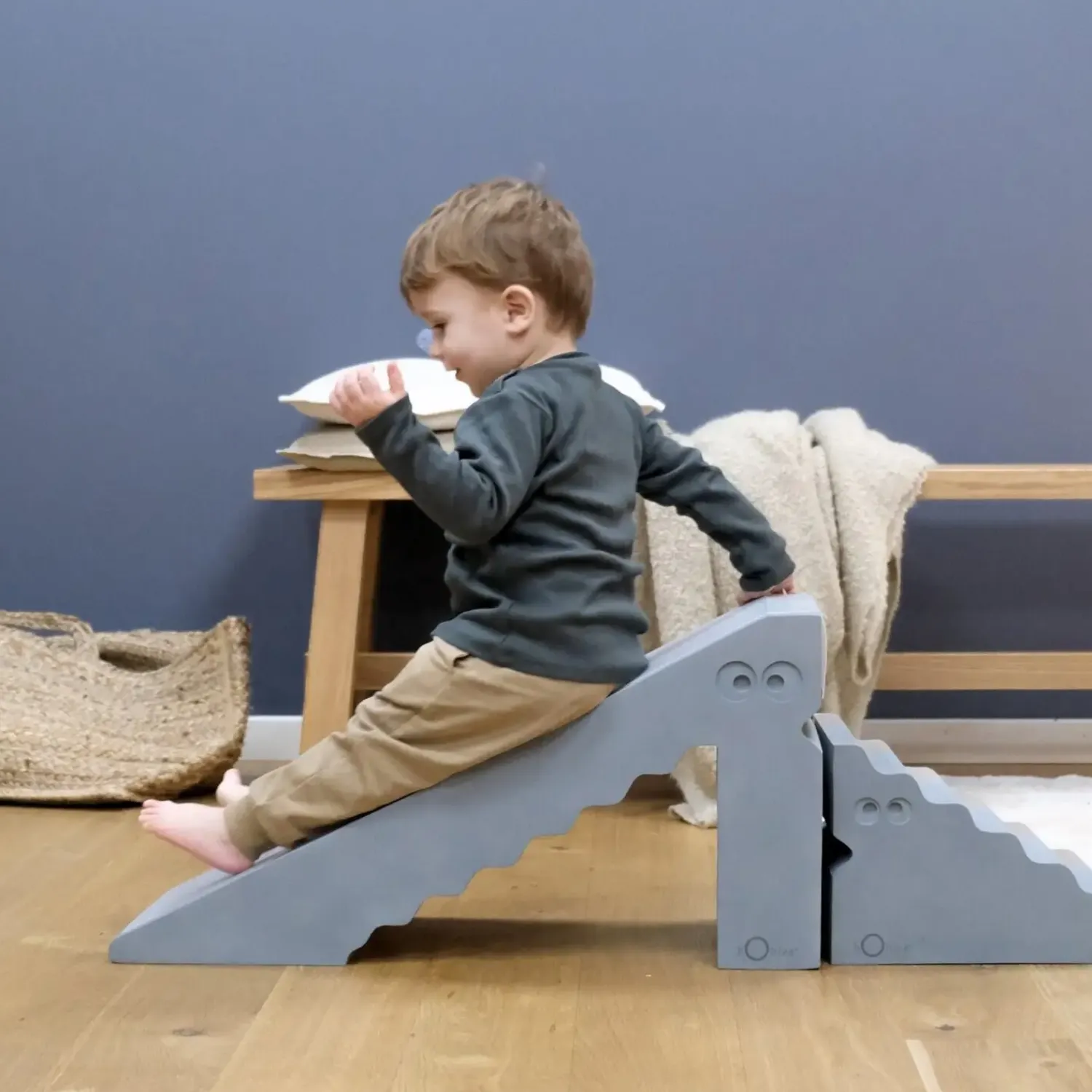 Hvis du mangler plads til flere legemøbler, giver Dino flere funktioner i ét produkt. Brug den som rutsjebane til aktiv leg, vend den på siden som balance-line, eller lad den fungere som skammel, når dit barn skal nå højere. Dette reducerer behovet for separate møbler.