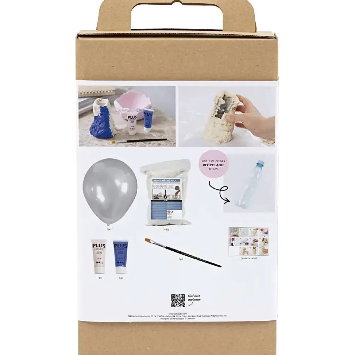 Med dette kit kan du lave en vase og skål i papmaché-pulp, som vil pynte overalt i dit hjem. Indeholder alle de materialer du skal bruge, og al den vejledning du behøver.Er du vild med hjemmelavet home decor, er dette DIY kit lige noget for dig. Med papmaché former du let din egen vase og skål – udtrykket må gerne være tilfældigt og rustikt – så passer det nemlig perfekt ind i tidens indretningstrend. Når begge er tørre, kan du male dem i flotte, klare farver. Det hyggelige DIY-projekt er et, som større børn også kan være med til.Indhold: Pulp, pensel, ballon, maling