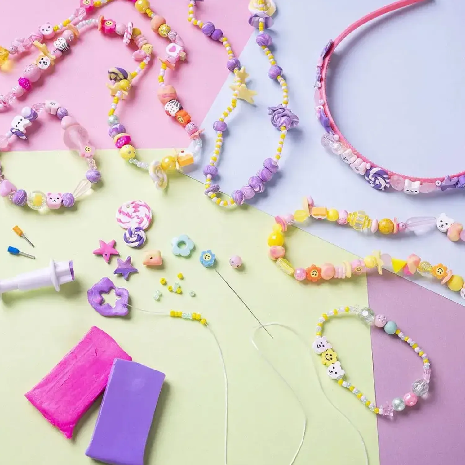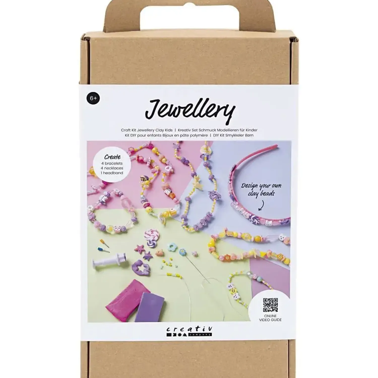 Med dette kit kan børn lave farverige smykker af smykkeler og flotte, farverige perler. Indeholder alle de materialer I skal bruge, og al den vejledning I behøver.Drømmer dine børn om at være smykkedesignere, er dette kit perfekt. Med det bløde og smidige polymer ler, er det supernemt at forme sine egne smykkeperler – både de runde og de stjerneformede. Når perlerne først har hærdet i ovnen, kan børnene begynde at lave armbånd, halskæder og hårbøjle i lige den stil, de ønsker.Indhold: Plastikperler, figurperler, rocaiperler, elastiksnor, lim, runde udstikkere, stjerneformede udstikkere, små udstikkere, dobbeltklæbende tape, hårbøjle, smykkeler