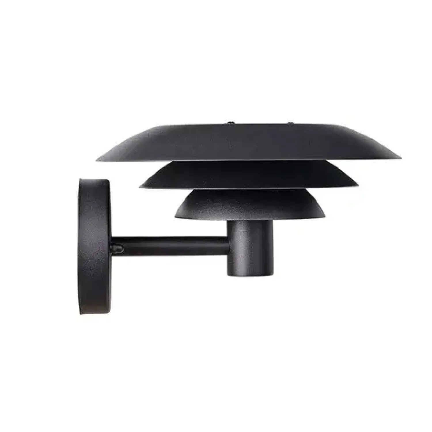 Dyberg Larsen – DL25 udendørs væglampe – Sort er fremstillet af rustfrit stål, et materiale valgt for dets evne til at modstå skiftende vejrforhold. Den matte sorte finish giver lampen et diskret udseende, der kan integreres i forskellige udendørsmiljøer. Med en diameter på 26,4 cm og en højde på 16,2 cm har denne væglampe en størrelse, der er designet til at give passende belysning uden at dominere facaden. Lampens form er udviklet med henblik på at kunne anvendes i forskellige arkitektoniske sammenhænge.