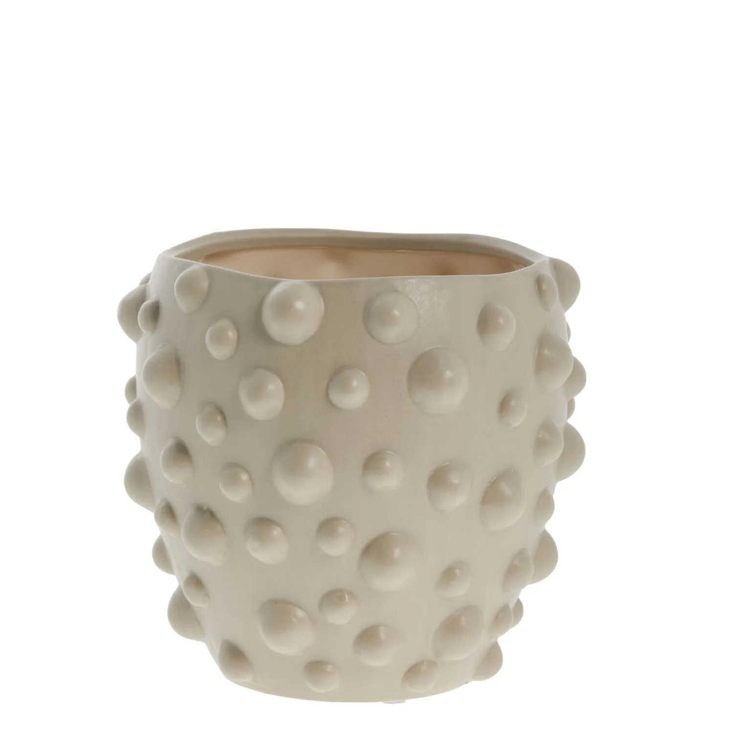 Doelle-skjuleren har en overflade med hævede, prikkede mønstre, der tilfører dybde og karakter. Den neutrale sandfarve giver et diskret udtryk, mens dens runde form og åbning gør den praktisk til både planter og dekorative formål.