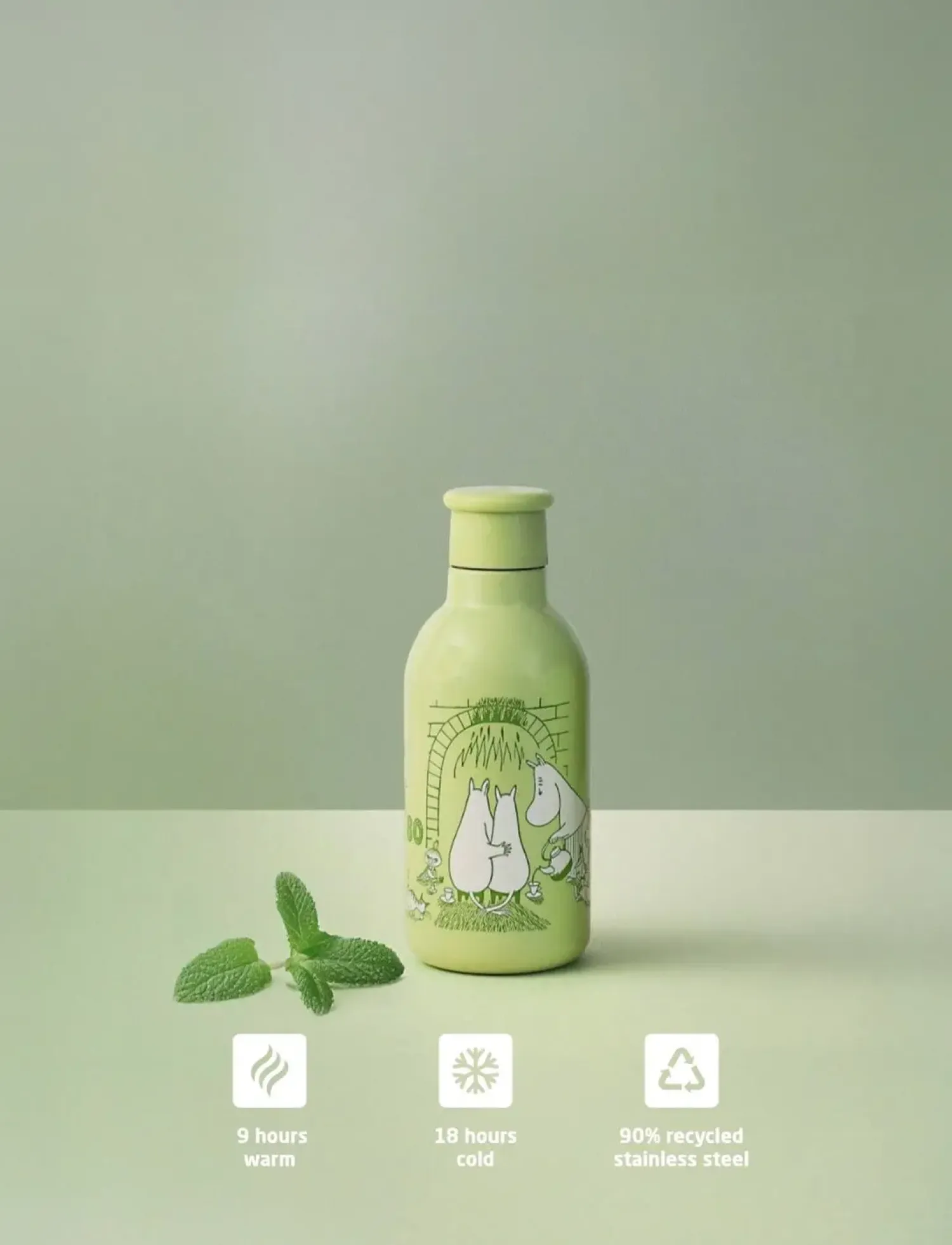Moomin lemonade stammer fra tegneseriestriben “Moomin Winter”. Illustrationen viser Mumimor, der med sin omsorgsfulde og blide facon endnu engang sørger for, at alle har det godt. Drink-it flasken er en ægte superhelt i din rygsæk! Med sit smarte skruelåg er det en leg for hele familien at åbne og lukke den – ingen udslip her! Flasken har en kapacitet på 0,5 liter og vejer næsten ingenting, perfekt til dine eventyr. Uanset om du vil holde din yndlingsdrik varm som en vulkan eller koldt som et isbjerg, er Drink-it den uundgåelige sidekick med sit dobbeltvæggede termoflaske-trick. Og det bedste af det hele? Den er skabt af genanvendt stål, så du kan starte dit eget bæredygtige eventyr i dag og redde planeten én slurk ad gangen!