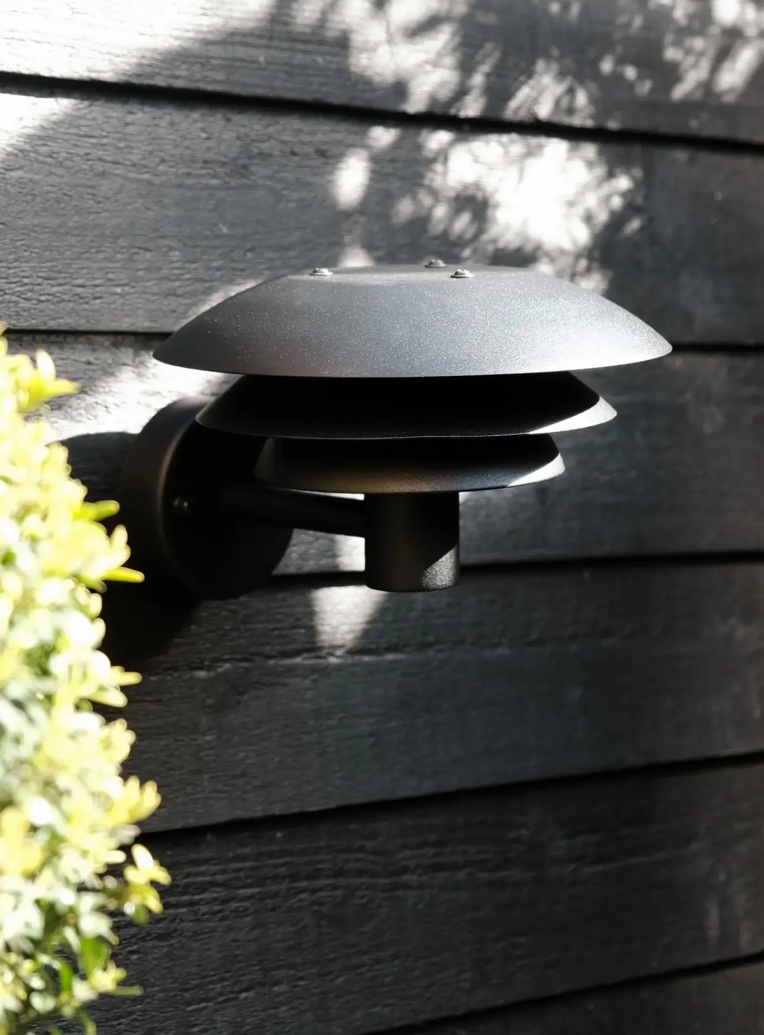 Dyberg Larsen – DL20 væglampe udmærker sig ved sin gennemtænkte konstruktion. Den cirkulære base sikrer en stabil montering på væggen, mens den tre-lagede, skiveformede lampeskærm bidrager til lysfordelingen. Lampens design er skabt til at fordele lyset effektivt over områder som hoveddøren, postkassen eller navneskiltet. Den sorte finish giver lampen et sofistikeret udseende, der komplementerer både moderne og klassiske bygningsfacader. Med en diameter på 20 cm er lampen tilpas stor til at gøre en visuel forskel uden at dominere facaden, hvilket gør den velegnet til både små og store udendørsarealer.