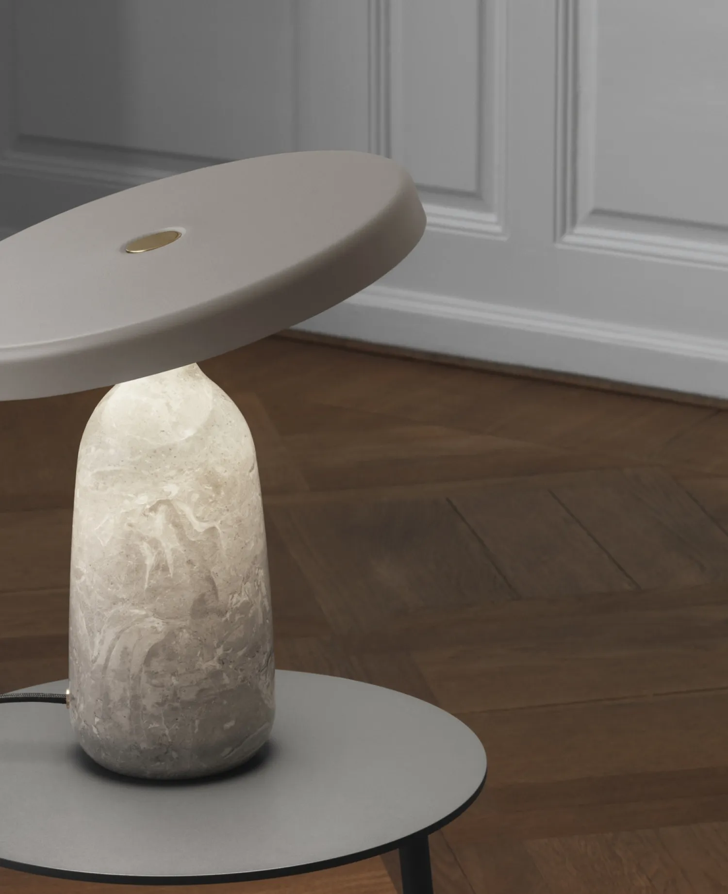 Eddy, bordlampen, er en kunst af proportioner: en luftig skærm svæver over en vægtig, organisk base og skaber et design i balance og bevægelse. Stål og marmor udgør hovedelementerne, mens gyldne shimmers af messing sætter prikken på ‘i’et’ på denne atmosfæriske lampe. Bordlampen består af en plan stålskærm med integreret LED-lyskilde, der balancerer på en lampefod lavet af hånd drejet italiensk marmor. Rotationsprocessen understreges af forholdet mellem en slank hals og en omfangsrig krop, som danner en på én gang livlig og tæt silhuet. Lampeskærm og base møder hinanden i et gyldent rotationspunkt i form af en blank messingkugle. Skærmen kan vippes rundt om bolden for at styre lysets retning. Med sin nedadvendte skærm oplyser Eddy ikke kun sine omgivelser, men også sig selv. Dens lys skinner ned på marmoren og understreger materialets skiftende karakter. Bordlampen udsender et blødt lys, som kan justeres med den cirkulære messingdæmper, der danner en raffineret detalje på lampeskærmens top.Designet af Simon Legald