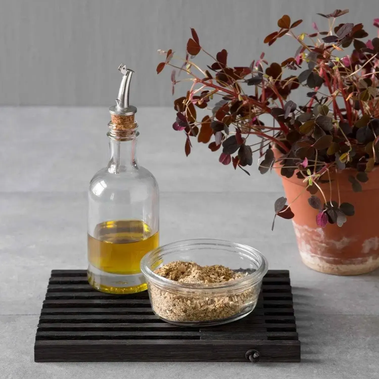 Sort egetræ er valgt for sin styrke og holdbarhed over længere tid. Den ribbede overflade giver ikke kun et struktureret udseende, men også et bedre greb, så bordskåneren ligger stabilt under dine varme fade. Den sorte farve passer ind i de fleste køkkenindretninger uden at dominere.